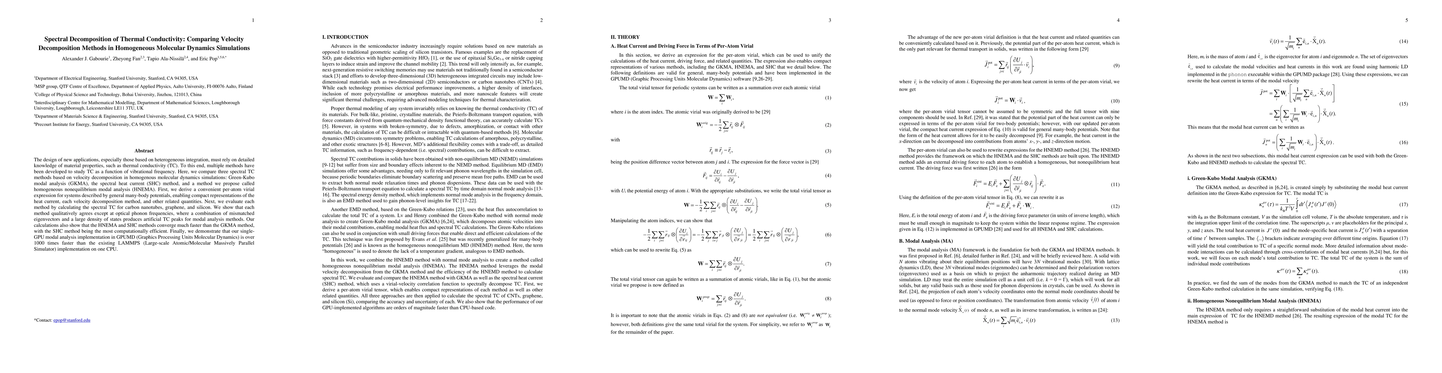 This paper compares three spectral thermal conductivity methods—Green-Kubo modal analysis (GKMA), spectral heat current (SHC), and the proposed homogeneous nonequilibrium modal analysis (HNEMA)—in molecular dynamics simulations. The HNEMA and SHC methods show faster convergence and computational efficiency, especially on GPUs.