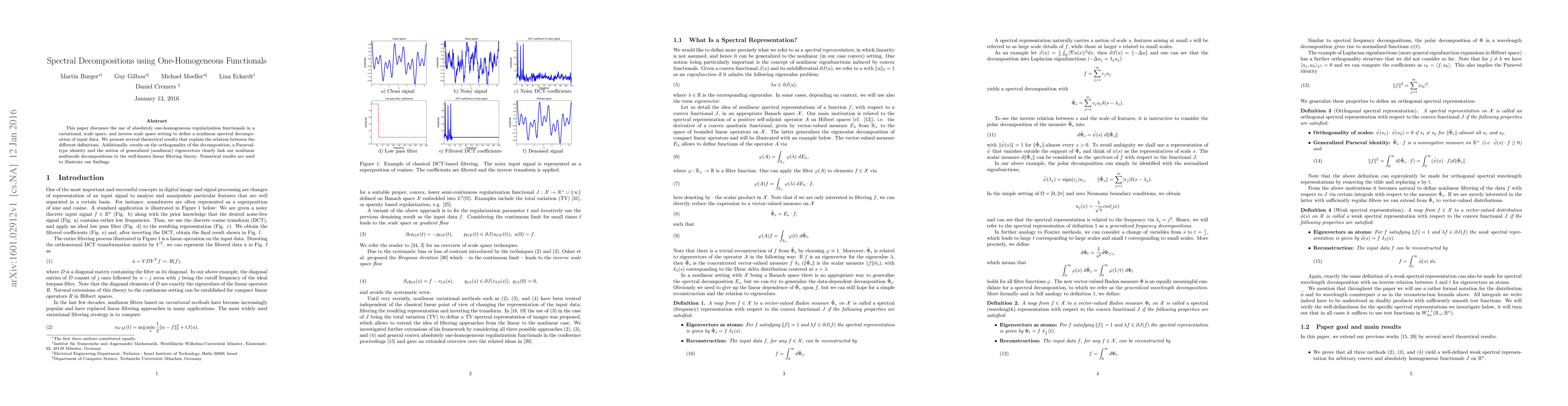 This paper explores the application of one-homogeneous regularization functionals for defining nonlinear spectral decompositions in variational and scale space settings. It establishes theoretical connections and presents results on orthogonality, Parseval-type identities, and generalized eigenvectors, linking these decompositions to linear filtering theory, with numerical examples to support the findings.
