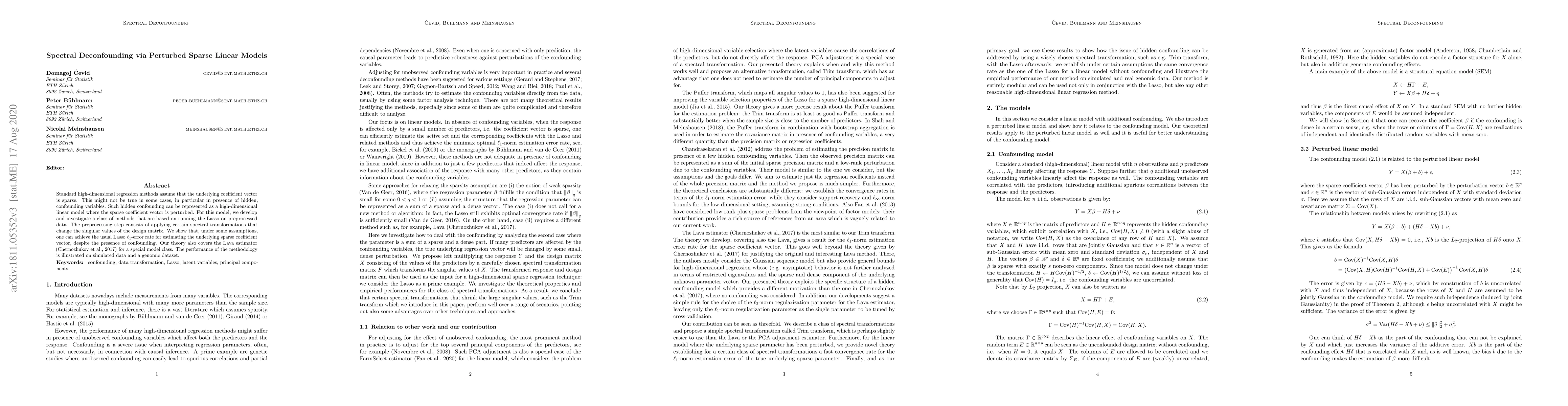 Standard high-dimensional regression methods assume that the underlying coefficient vector is sparse. This might not be true in some cases, in particular in presence of hidden, confounding variables. Such hidden confounding can be represented as a high-dimensional linear model where the sparse coefficient vector is perturbed. For this model, we develop and investigate a class of methods that are based on running the Lasso on preprocessed data. The preprocessing step consists of applying certain spectral transformations that change the singular values of the design matrix. We show that, under some assumptions, one can achieve the optimal $\ell_1$-error rate for estimating the underlying sparse coefficient vector. Our theory also covers the Lava estimator (Chernozhukov et al. [2017]) for a special model class. The performance of the method is illustrated on simulated data and a genomic dataset.