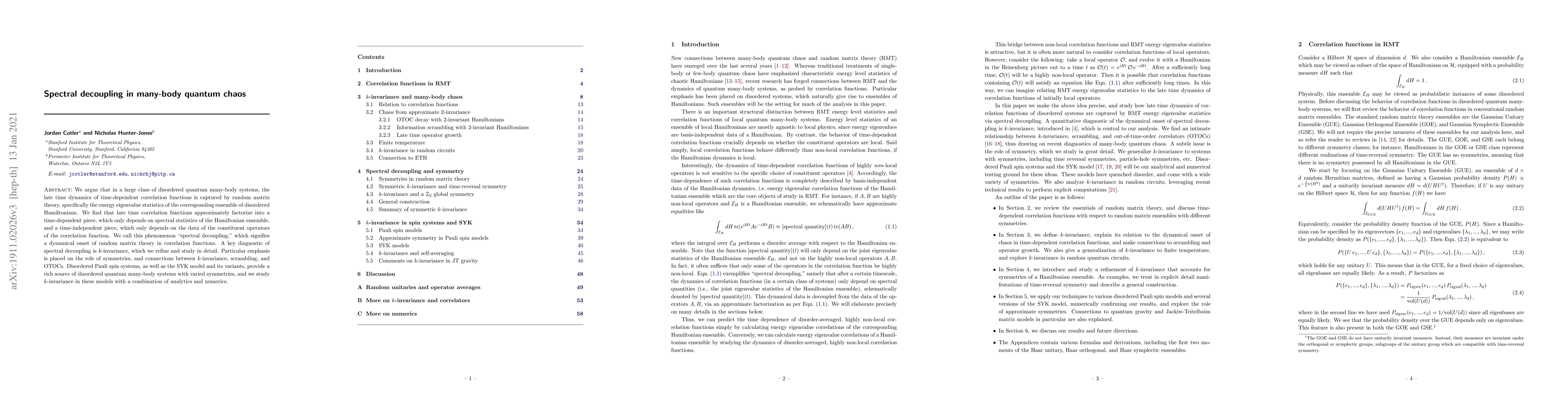 We argue that in a large class of disordered quantum many-body systems, the late time dynamics of time-dependent correlation functions is captured by random matrix theory, specifically the energy eigenvalue statistics of the corresponding ensemble of disordered Hamiltonians. We find that late time correlation functions approximately factorize into a time-dependent piece, which only depends on spectral statistics of the Hamiltonian ensemble, and a time-independent piece, which only depends on the data of the constituent operators of the correlation function. We call this phenomenon "spectral decoupling," which signifies a dynamical onset of random matrix theory in correlation functions. A key diagnostic of spectral decoupling is $k$-invariance, which we refine and study in detail. Particular emphasis is placed on the role of symmetries, and connections between $k$-invariance, scrambling, and OTOCs. Disordered Pauli spin systems, as well as the SYK model and its variants, provide a rich source of disordered quantum many-body systems with varied symmetries, and we study $k$-invariance in these models with a combination of analytics and numerics.