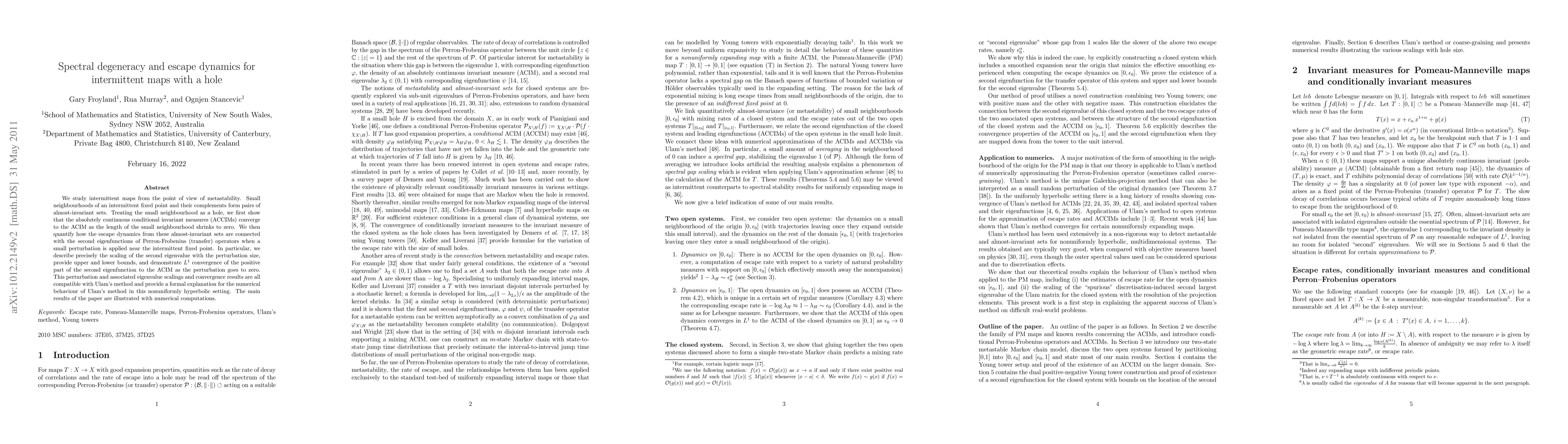 This research explores intermittent maps' metastability, showing that small neighborhoods of an intermittent fixed point and their complements form pairs of almost-invariant sets. It demonstrates how escape dynamics from these sets relate to Perron-Frobenius operators' eigenfunctions when a small perturbation is applied near the fixed point, providing scaling of the second eigenvalue with perturbation size, and proving L1 convergence of the positive part of the second eigenfunction to the ACIM as the perturbation approaches zero. These findings align with Ulam's method, offering insight into its numerical behavior in nonuniformly hyperbolic settings.