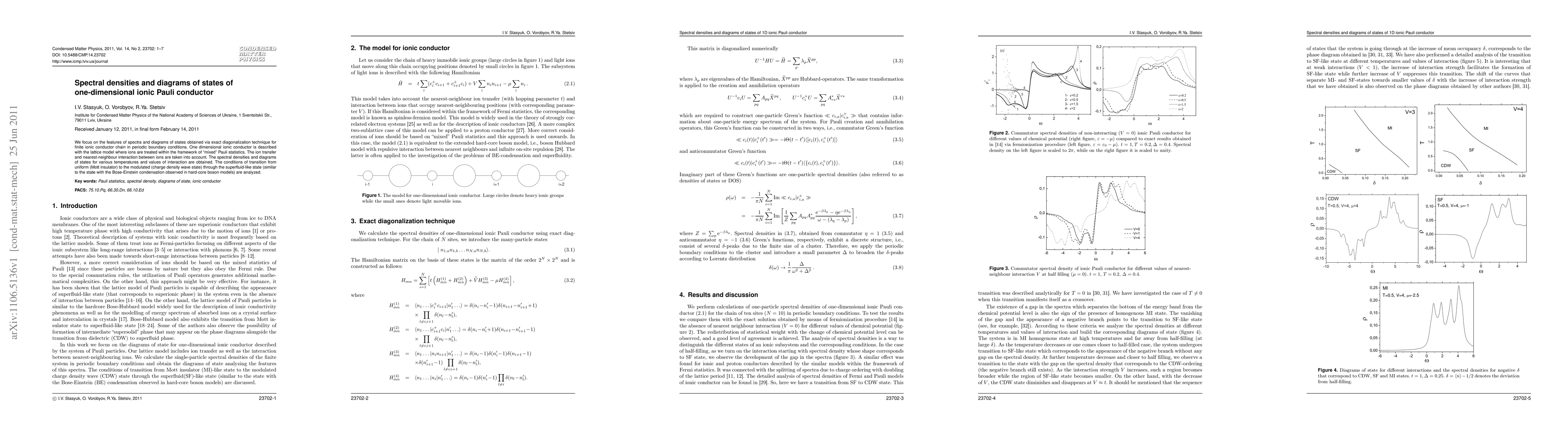 We focus on the features of spectra and diagrams of states obtained via exact diagonalization technique for finite ionic conductor chain in periodic boundary conditions. One dimensional ionic conductor is described with the lattice model where ions are treated within the framework of "mixed" Pauli statistics. The ion transfer and nearest-neighbour interaction between ions are taken into account. The spectral densities and diagrams of states for various temperatures and values of interaction are obtained. The conditions of transition from uniform (Mott insulator) to the modulated (charge density wave state) through the superfluid-like state (similar to the state with the Bose-Einstein condensation observed in hard-core boson models) are analyzed.