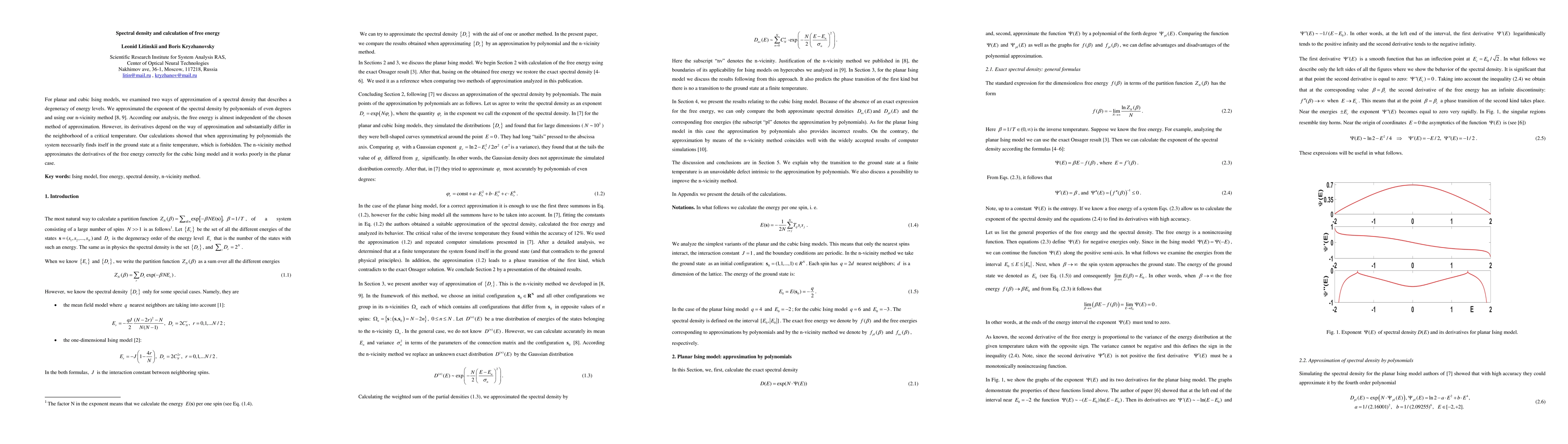 For planar and cubic Ising models, we examined two ways of approximation of a spectral density that describes a degeneracy of energy levels. We approximated the exponent of the spectral density by polynomials of even degrees and using our n-vicinity method [8, 9]. According our analysis, the free energy is almost independent of the chosen method of approximation. However, its derivatives depend on the way of approximation and substantially differ in the neighborhood of a critical temperature. Our calculations showed that when approximating by polynomials the system necessarily finds itself in the ground state at a finite temperature, which is forbidden. The n-vicinity method approximates the derivatives of the free energy correctly for the cubic Ising model and it works poorly in the planar case.