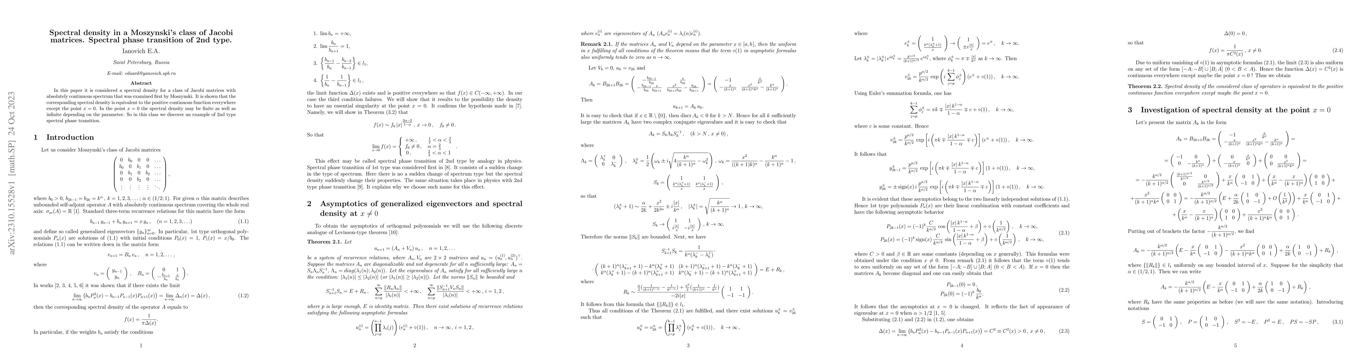 This paper examines the spectral density of a class of Jacobi matrices introduced by Moszynski, revealing that it behaves as a positive continuous function except at $x=0$, where it can be finite or infinite depending on a parameter, demonstrating a spectral phase transition of the 2nd type.