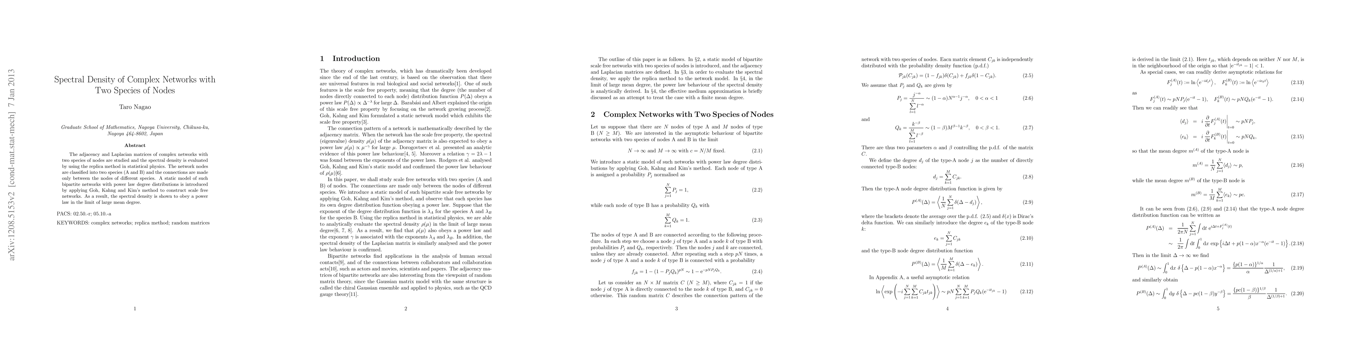 Researchers studied bipartite networks with two species of nodes, finding that their spectral density follows a power law in the limit of large mean degree.