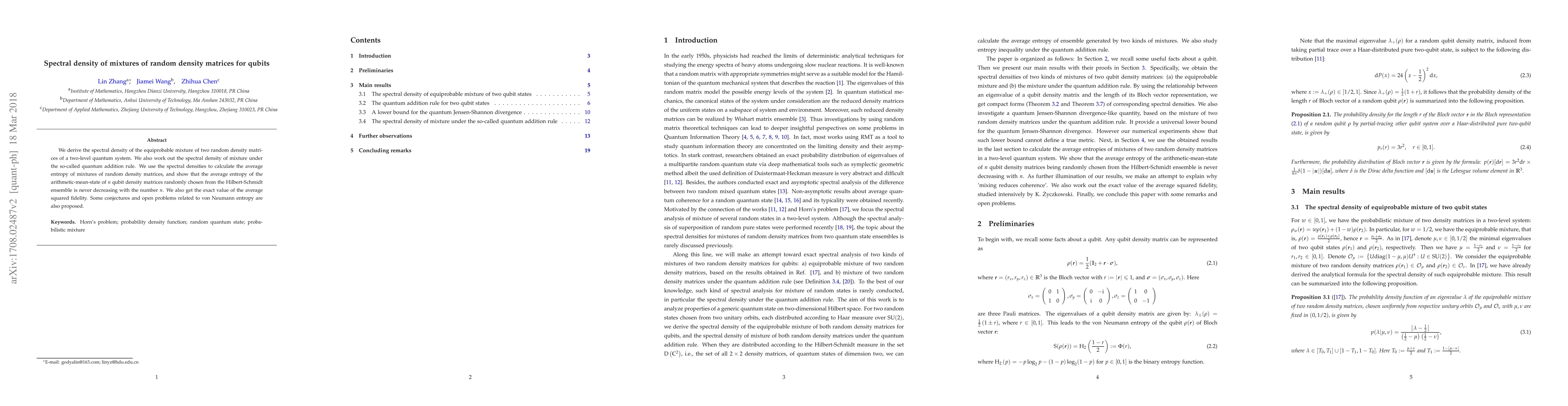 The paper derives the spectral density for mixtures of random density matrices in qubits and calculates the average entropy and average squared fidelity for such mixtures. It demonstrates that the average entropy of the arithmetic mean of $n$ random qubit density matrices is non-decreasing with $n$, and proposes conjectures related to von Neumann entropy.