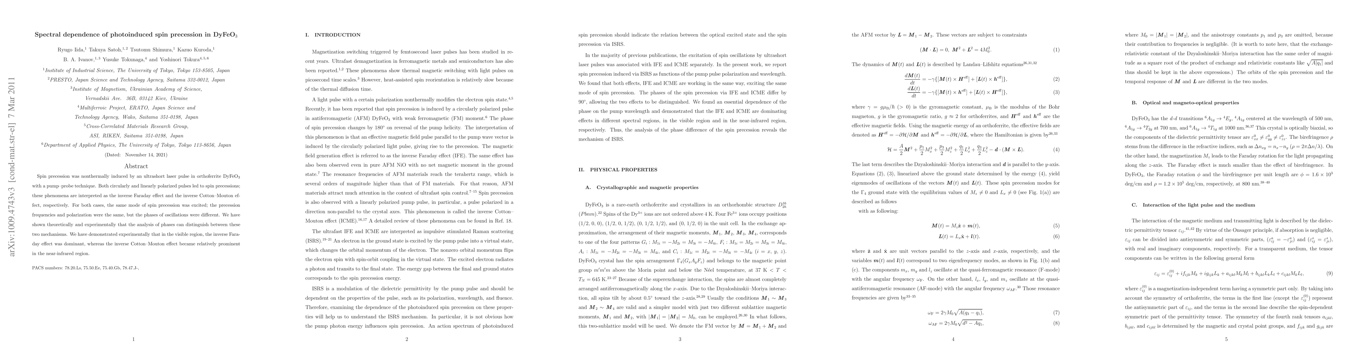 This paper explores the spectral dependence of photoinduced spin precession in DyFeO3 using ultrashort laser pulses, revealing that both circularly and linearly polarized pulses induce spin precession interpreted as the inverse Faraday and inverse Cotton-Mouton effects, respectively. The study demonstrates that while the precession frequencies and polarization are the same, the phases differ, allowing for their distinction, with the inverse Faraday effect dominating in the visible region and the inverse Cotton-Mouton effect becoming more significant in the near-infrared.