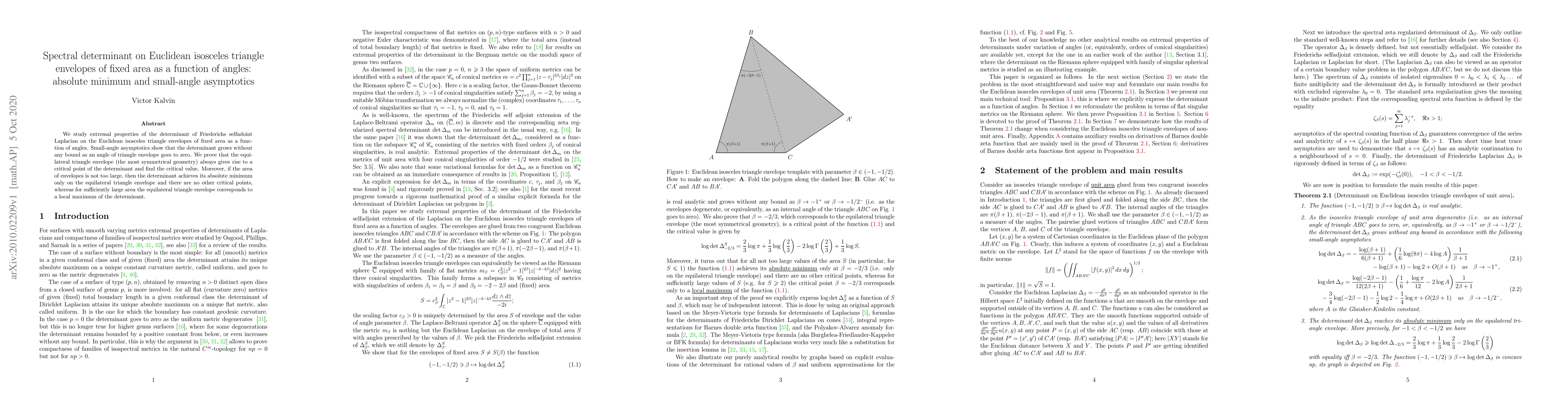 This paper investigates the determinant of the Friedrichs Laplacian on isosceles triangle envelopes with fixed area, finding that the determinant grows unbounded as the smallest angle approaches zero. The equilateral triangle envelope yields a critical point for the determinant, serving as the absolute minimum for small areas and a local maximum for larger areas.