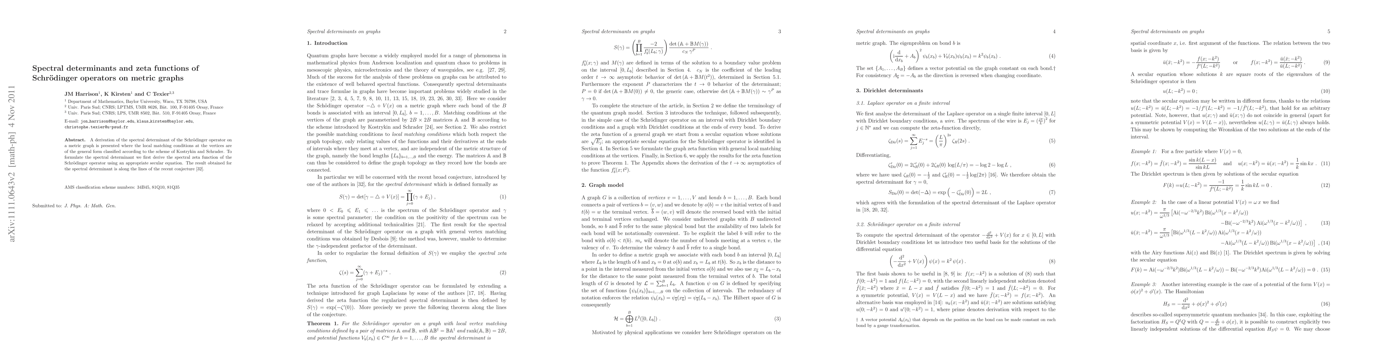 This paper derives the spectral determinant of the Schr"odinger operator on metric graphs, aligning with a recent conjecture, using a secular equation to formulate the spectral zeta function.