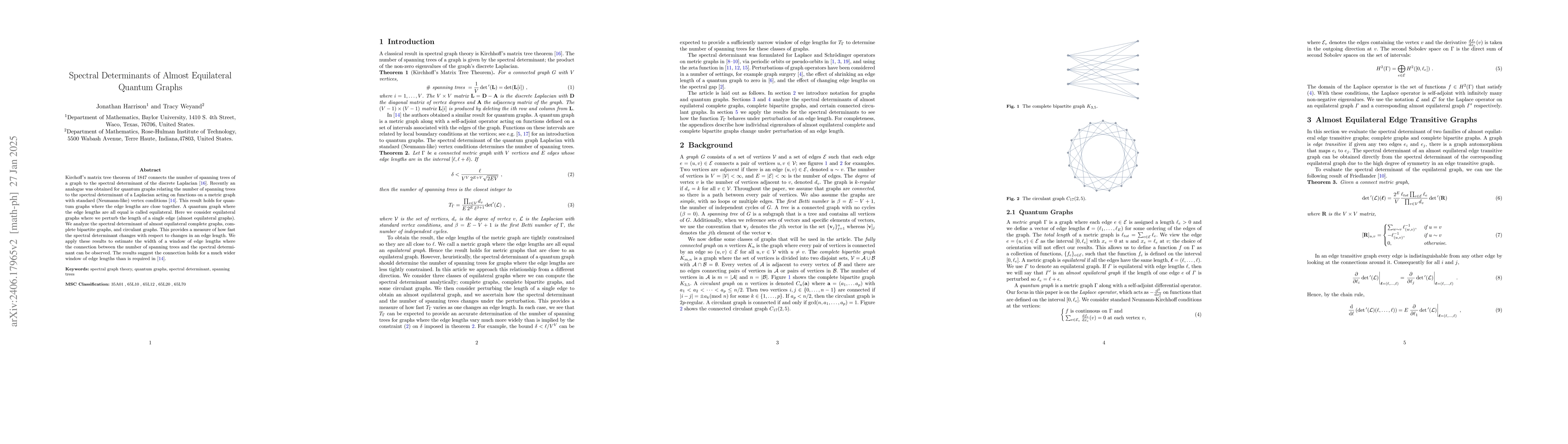 Kirchoff's matrix tree theorem of 1847 connects the number of spanning trees of a graph to the spectral determinant of the discrete Laplacian [6]. Recently an analogue was obtained for quantum graphs relating the number of spanning trees to the spectral determinant of a Laplacian acting on functions on a metric graph with standard (Neumann-like) vertex conditions [11]. This result holds for quantum graphs where the edge lengths are close together. A quantum graph where the edge lengths are all equal is called equilateral. Here we consider equilateral graphs where we perturb the length of a single edge (almost equilateral graphs). We analyze the spectral determinant of almost equilateral complete graphs, complete bipartite graphs, and circulant graphs. This provides a measure of how fast the spectral determinant changes with respect to changes in an edge length. We apply these results to estimate the width of a window of edge lengths where the connection between the number of spanning trees and the spectral determinant can be observed. The results suggest the connection holds for a much wider window of edge lengths than is required in [11].