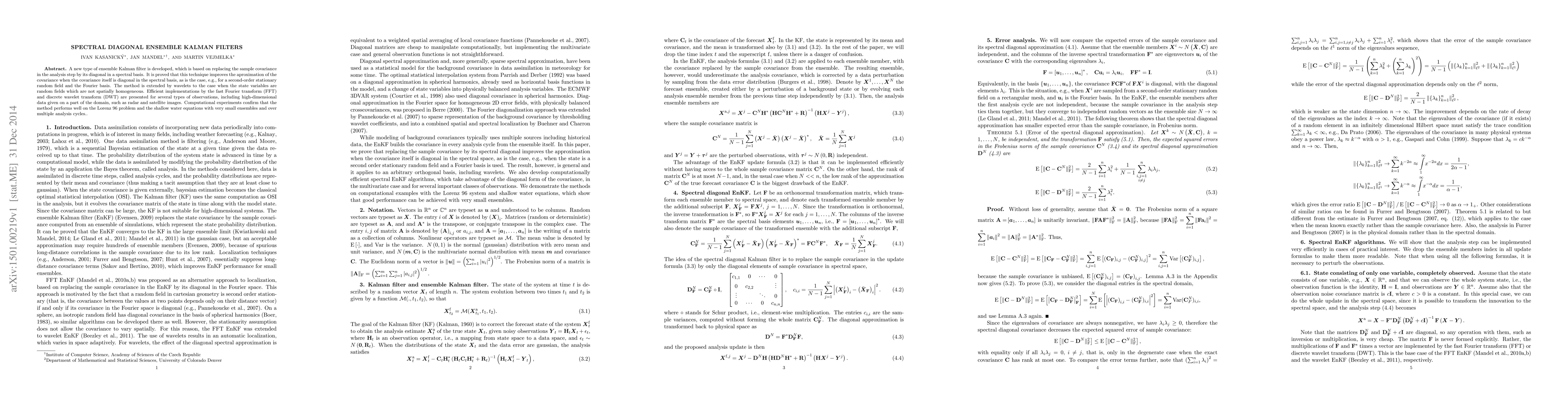 A new type of ensemble Kalman filter is developed, which is based on replacing the sample covariance in the analysis step by its diagonal in a spectral basis. It is proved that this technique improves the aproximation of the covariance when the covariance itself is diagonal in the spectral basis, as is the case, e.g., for a second-order stationary random field and the Fourier basis. The method is extended by wavelets to the case when the state variables are random fields, which are not spatially homogeneous. Efficient implementations by the fast Fourier transform (FFT) and discrete wavelet transform (DWT) are presented for several types of observations, including high-dimensional data given on a part of the domain, such as radar and satellite images. Computational experiments confirm that the method performs well on the Lorenz 96 problem and the shallow water equations with very small ensembles and over multiple analysis cycles.
