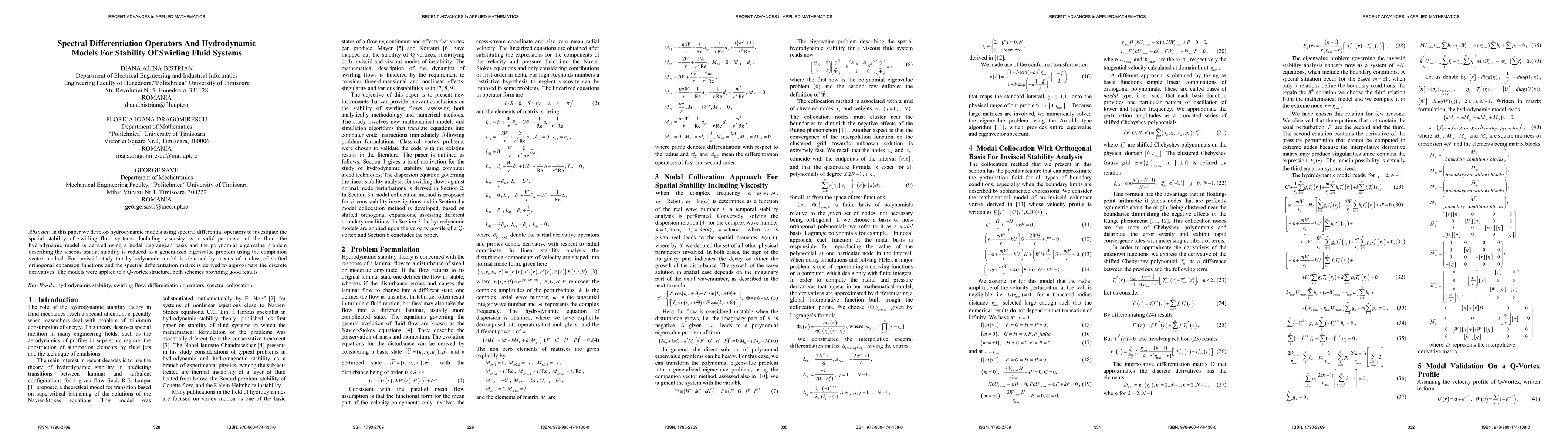 This paper develops hydrodynamic models using spectral differential operators to study the spatial stability of swirling fluid systems, employing both viscous and inviscid approaches. The viscous model uses a nodal Lagrangian basis, while the inviscid model utilizes shifted orthogonal expansion functions, both yielding accurate results for a Q-vortex structure.