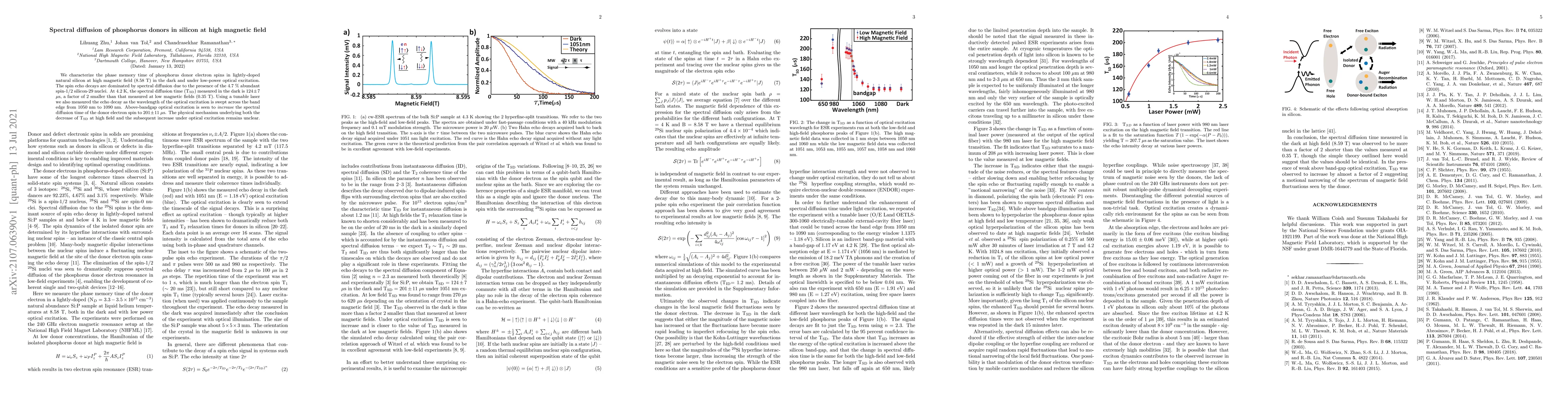 Researchers studied phosphorus donors in silicon at high magnetic fields, finding a significant decrease in phase memory time due to spectral diffusion. Increasing the wavelength of optical excitation above the bandgap increased this time further.