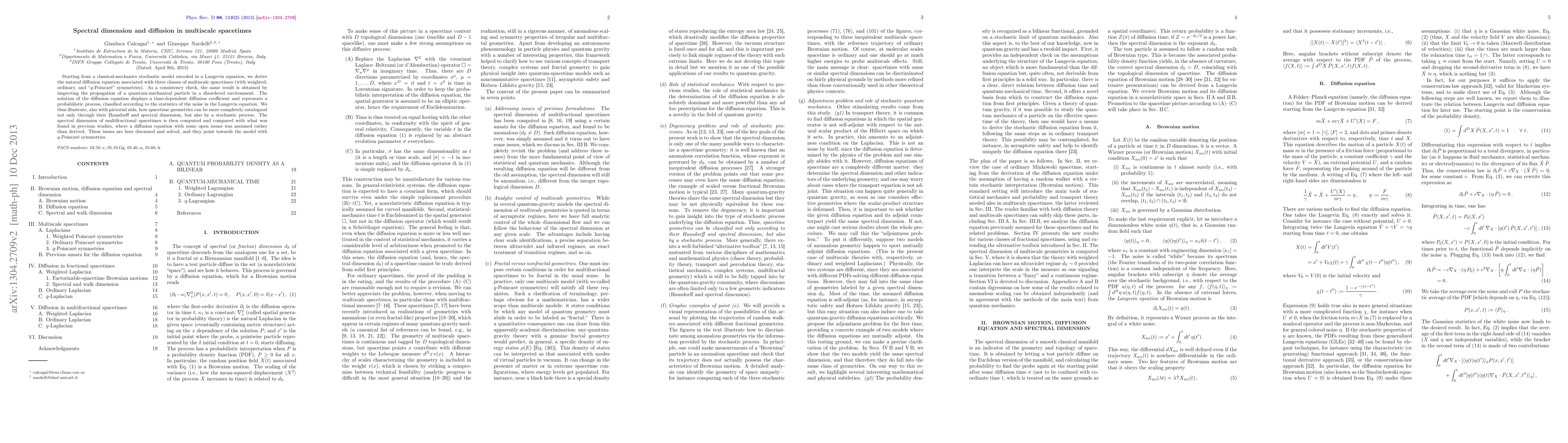 Starting from a classical-mechanics stochastic model encoded in a Langevin equation, we derive the natural diffusion equation associated with three classes of multiscale spacetimes (with weighted, ordinary, and "q-Poincar\'e" symmetries). As a consistency check, the same result is obtained by inspecting the propagation of a quantum-mechanical particle in a disordered environment. The solution of the diffusion equation displays a time-dependent diffusion coefficient and represents a probabilistic process, classified according to the statistics of the noise in the Langevin equation. We thus illustrate, also with pictorial aids, how spacetime geometries can be more completely catalogued not only through their Hausdorff and spectral dimension, but also by a stochastic process. The spectral dimension of multifractional spacetimes is then computed and compared with what was found in previous studies, where a diffusion equation with some open issues was assumed rather than derived. These issues are here discussed and solved, and they point towards the model with q-Poincar\'e symmetries.