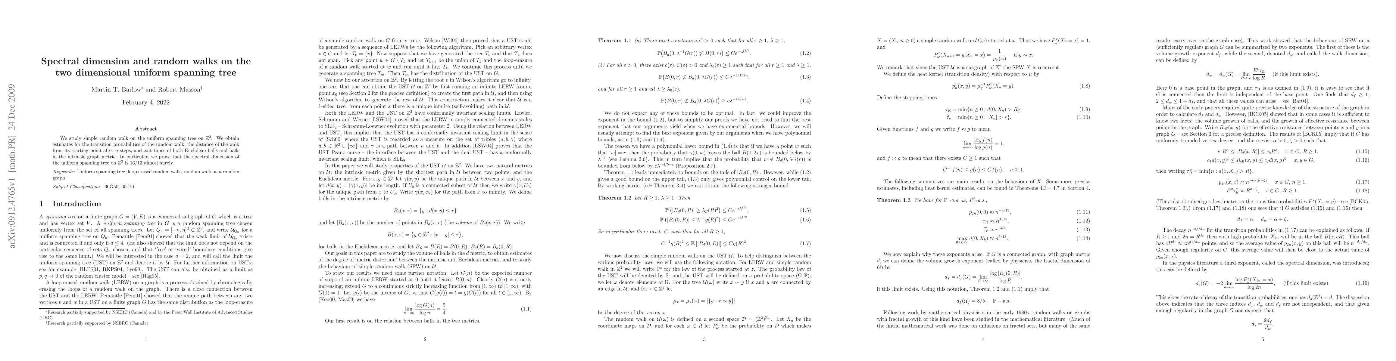Researchers studied a random walk on the 2D uniform spanning tree, finding that its spectral dimension is approximately 16/13 almost surely, indicating a unique geometric structure.