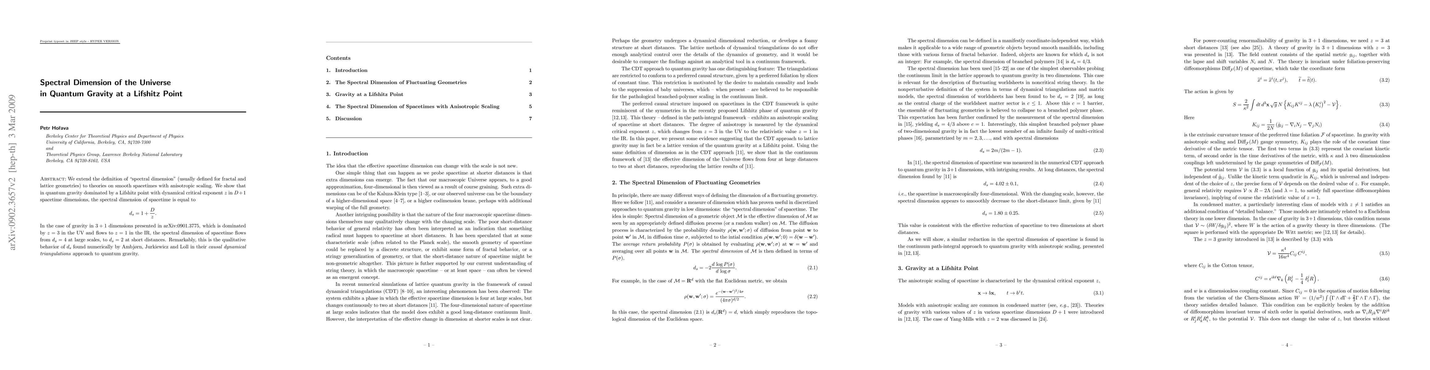 We extend the definition of "spectral dimension" (usually defined for fractal and lattice geometries) to theories on smooth spacetimes with anisotropic scaling. We show that in quantum gravity dominated by a Lifshitz point with dynamical critical exponent z in D+1 spacetime dimensions, the spectral dimension of spacetime is equal to d_s=1+D/z. In the case of gravity in 3+1 dimensions presented in arXiv:0901.3775, which is dominated by z=3 in the UV and flows to z=1 in the IR, the spectral dimension of spacetime flows from d_s=4 at large scales, to d_s=2 at short distances. Remarkably, this is the qualitative behavior of d_s found numerically by Ambjorn, Jurkiewicz and Loll in their causal dynamical triangulations approach to quantum gravity.
