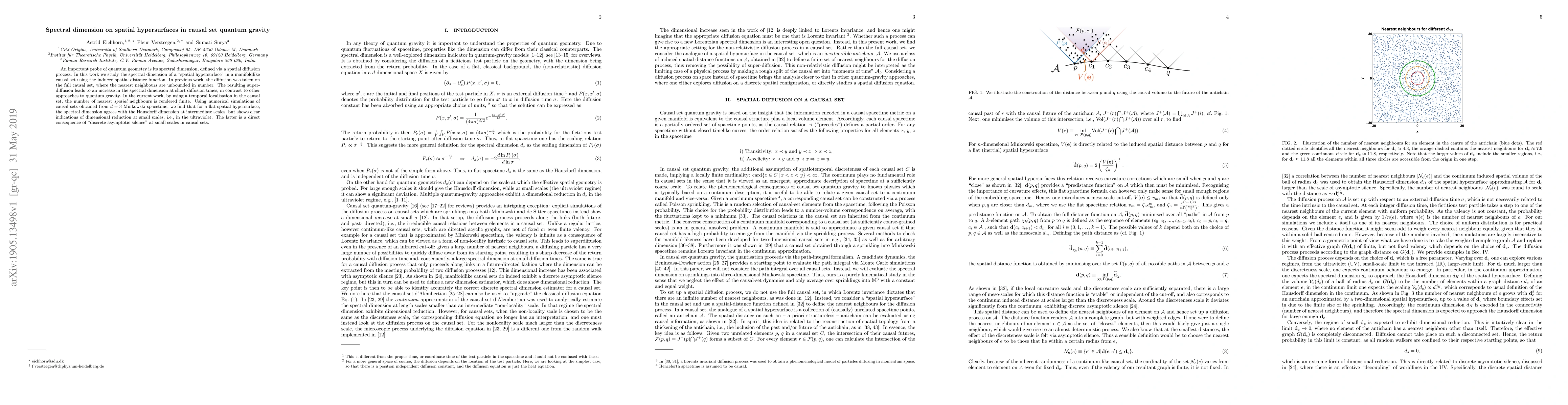 This paper investigates the spectral dimension on spatial hypersurfaces within causal set quantum gravity, finding that it aligns with the Hausdorff dimension at intermediate scales but exhibits dimensional reduction at small scales due to "discrete asymptotic silence." The study uses temporal localization to limit the number of nearest neighbors, contrasting with previous work that showed super-diffusion.