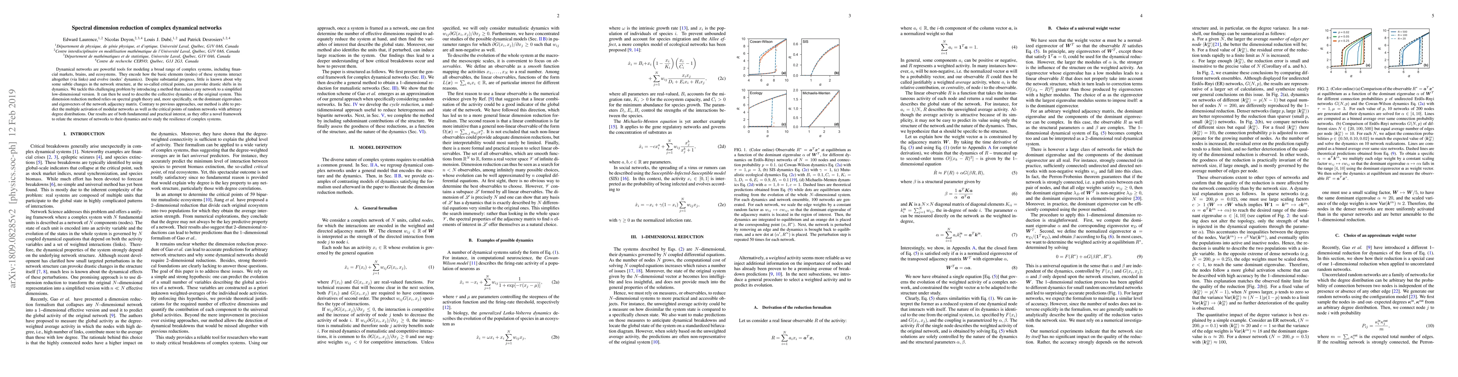 Dynamical networks are powerful tools for modeling a broad range of complex systems, including financial markets, brains, and ecosystems. They encode how the basic elements (nodes) of these systems interact altogether (via links) and evolve (nodes' dynamics). Despite substantial progress, little is known about why some subtle changes in the network structure, at the so-called critical points, can provoke drastic shifts in its dynamics. We tackle this challenging problem by introducing a method that reduces any network to a simplified low-dimensional version. It can then be used to describe the collective dynamics of the original system. This dimension reduction method relies on spectral graph theory and, more specifically, on the dominant eigenvalues and eigenvectors of the network adjacency matrix. Contrary to previous approaches, our method is able to predict the multiple activation of modular networks as well as the critical points of random networks with arbitrary degree distributions. Our results are of both fundamental and practical interest, as they offer a novel framework to relate the structure of networks to their dynamics and to study the resilience of complex systems.