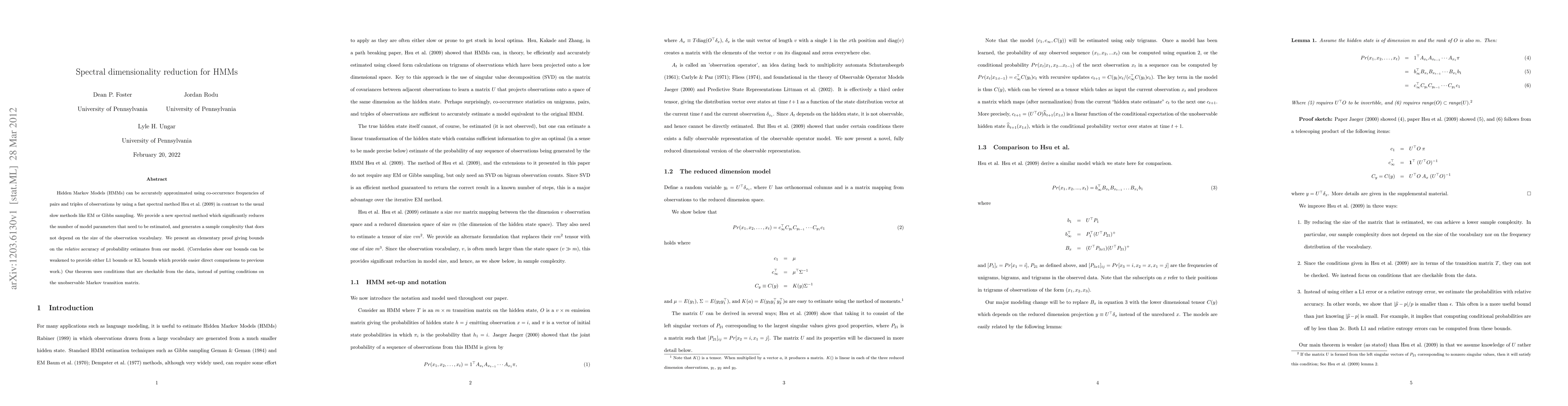 Hidden Markov Models (HMMs) can be accurately approximated using co-occurrence frequencies of pairs and triples of observations by using a fast spectral method in contrast to the usual slow methods like EM or Gibbs sampling. We provide a new spectral method which significantly reduces the number of model parameters that need to be estimated, and generates a sample complexity that does not depend on the size of the observation vocabulary. We present an elementary proof giving bounds on the relative accuracy of probability estimates from our model. (Correlaries show our bounds can be weakened to provide either L1 bounds or KL bounds which provide easier direct comparisons to previous work.) Our theorem uses conditions that are checkable from the data, instead of putting conditions on the unobservable Markov transition matrix.