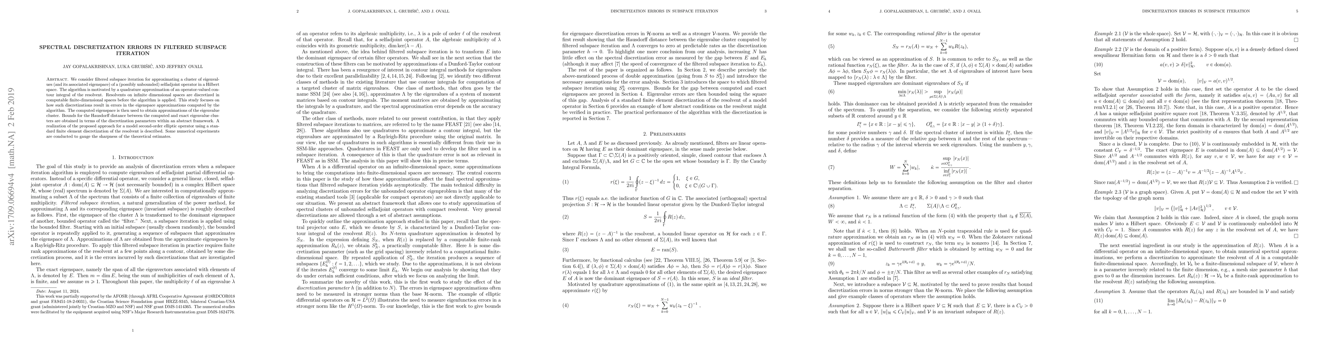 We consider filtered subspace iteration for approximating a cluster of eigenvalues (and its associated eigenspace) of a (possibly unbounded) selfadjoint operator in a Hilbert space. The algorithm is motivated by a quadrature approximation of an operator-valued contour integral of the resolvent. Resolvents on infinite dimensional spaces are discretized in computable finite-dimensional spaces before the algorithm is applied. This study focuses on how such discretizations result in errors in the eigenspace approximations computed by the algorithm. The computed eigenspace is then used to obtain approximations of the eigenvalue cluster. Bounds for the Hausdorff distance between the computed and exact eigenvalue clusters are obtained in terms of the discretization parameters within an abstract framework. A realization of the proposed approach for a model second-order elliptic operator using a standard finite element discretization of the resolvent is described. Some numerical experiments are conducted to gauge the sharpness of the theoretical estimates.