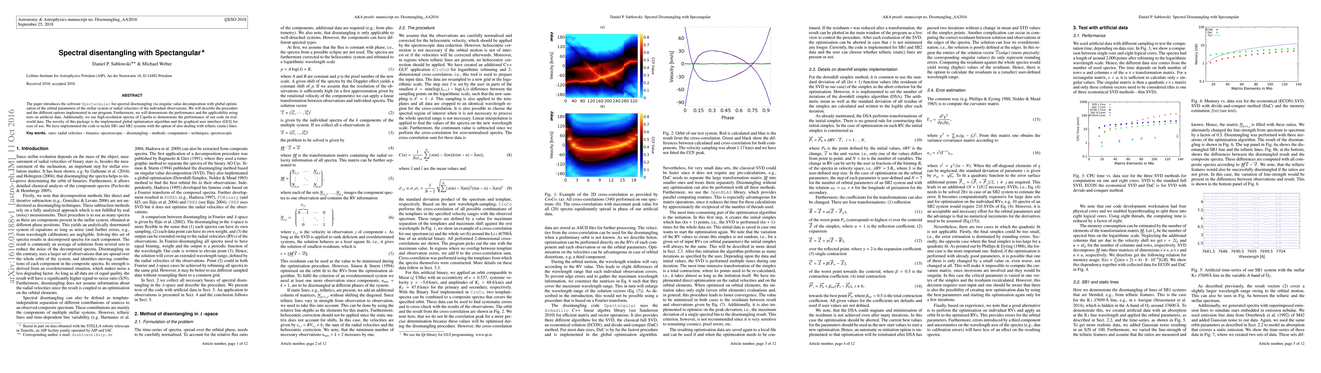 The paper introduces the software Spectangular for spectral disentangling via singular value decomposition with global optimisation of the orbital parameters of the stellar system or radial velocities of the individual observations. We will describe the procedure and the different options implemented in our program. Furthermore, we will demonstrate the performance and the applicability using tests on artificial data. Additionally, we use high-resolution spectra of Capella to demonstrate the performance of our code on real-world data. The novelty of this package is the implemented global optimisation algorithm and the graphical user interface (GUI) for ease of use. We have implemented the code to tackle SB1 and SB2 systems with the option of also dealing with telluric (static) lines.