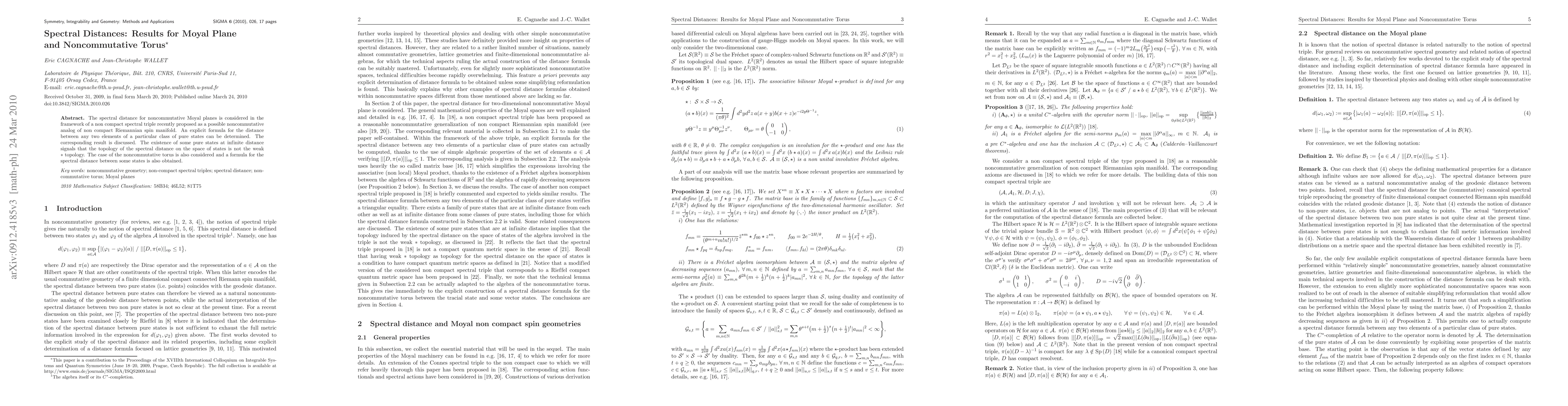 This paper investigates spectral distances on noncommutative Moyal planes and noncommutative tori, deriving explicit formulas for distances between certain pure states. It reveals that the topology of the spectral distance does not align with the weak * topology due to the existence of pure states at infinite distance.