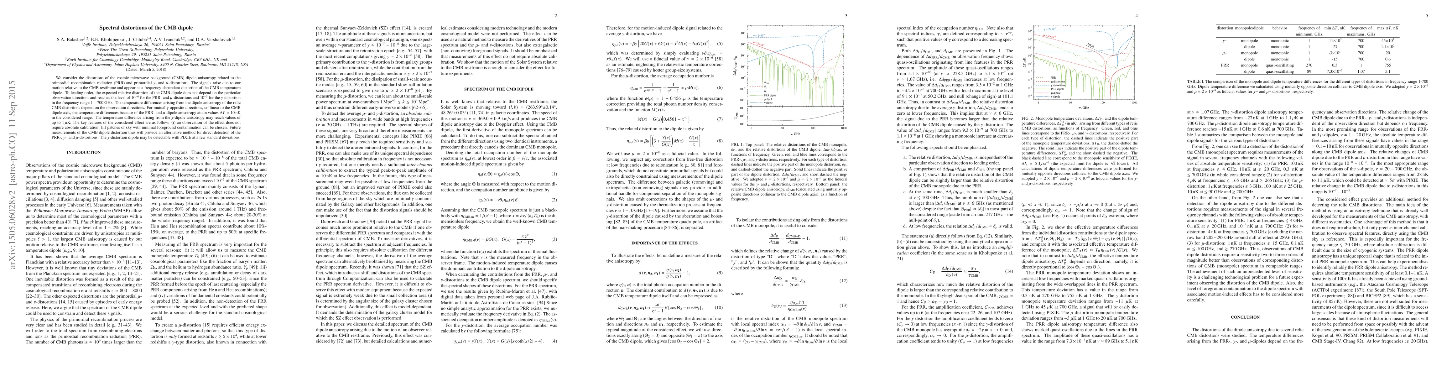 This paper investigates the spectral distortions of the CMB dipole anisotropy caused by primordial recombination radiation and $y$- and $\mu$-distortions, revealing frequency-dependent temperature differences up to $1\,\mu$K. Future CMB dipole measurements offer an alternative method for detecting these distortions, with the $y$-distortion potentially detectable by PIXIE.