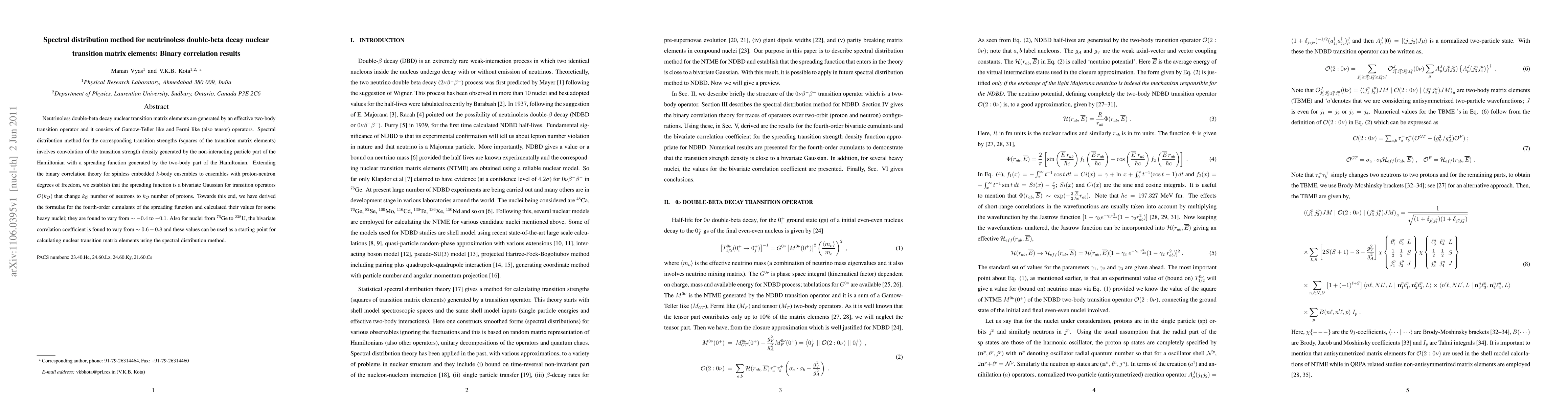 This paper develops a spectral distribution method for calculating neutrinoless double-beta decay nuclear transition matrix elements, showing that the spreading function is a bivariate Gaussian. The study derives formulas for fourth-order cumulants and calculates their values, finding that the bivariate correlation coefficient for heavy nuclei ranges from 0.6 to 0.8.