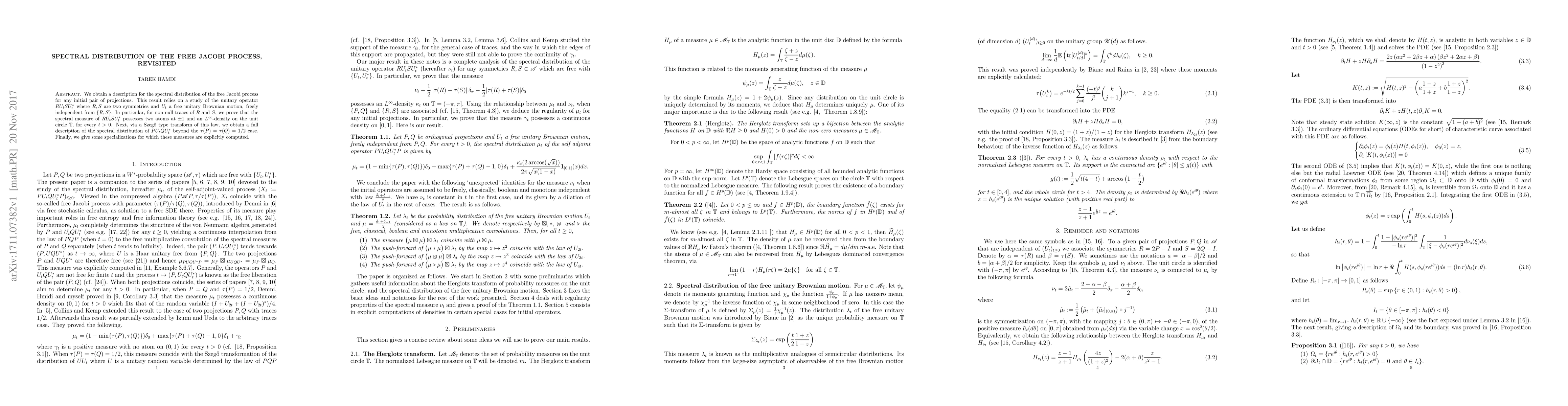 We obtain a description for the spectral distribution of the free Jacobi process for any initial pair of projections. This result relies on a study of the unitary operator $RU_tSU_t^*$ where $R,S$ are two symmetries and $U_t$ a free unitary Brownian motion, freely independent from $\{R,S\}$. In particular, for non-null traces of $R$ and $S$, we prove that the spectral measure of $RU_tSU_t^*$ possesses two atoms at $\pm1$ and an $L^\infty$-density on the unit circle $\mathbb{T}$, for every $t>0$. Next, via a Szeg\H{o} type transform of this law, we obtain a full description of the spectral distribution of $PU_tQU_t^*$ beyond the $\tau(P)=\tau(Q)=1/2$ case. Finally, we give some specializations for which these measures are explicitly computed.