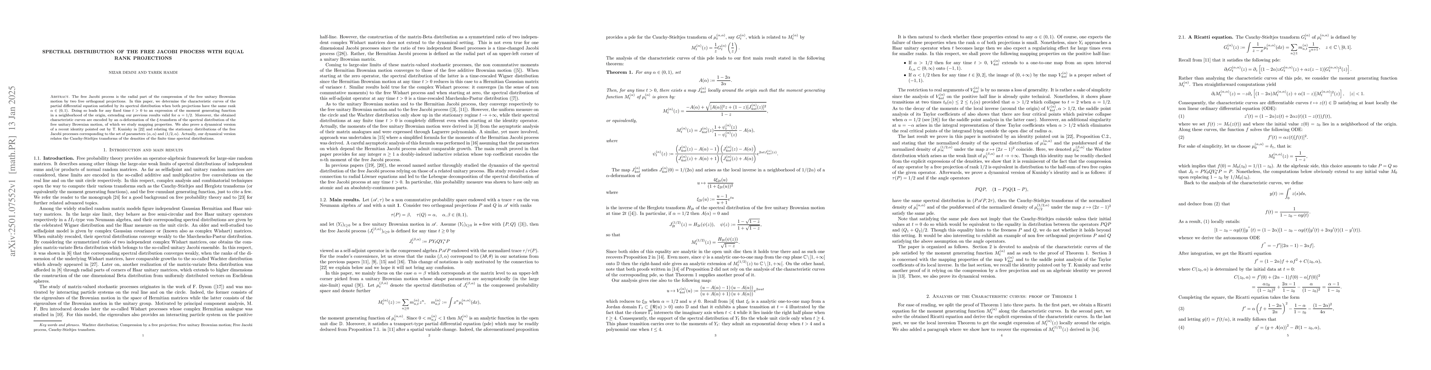 This paper examines the spectral distribution of the free Jacobi process under equal rank projections, deriving the characteristic curves of its associated partial differential equation. It extends moment generating functions and studies the $\alpha$-deformed $\xi$-transform, proving a dynamical identity relating different sets of parameters.