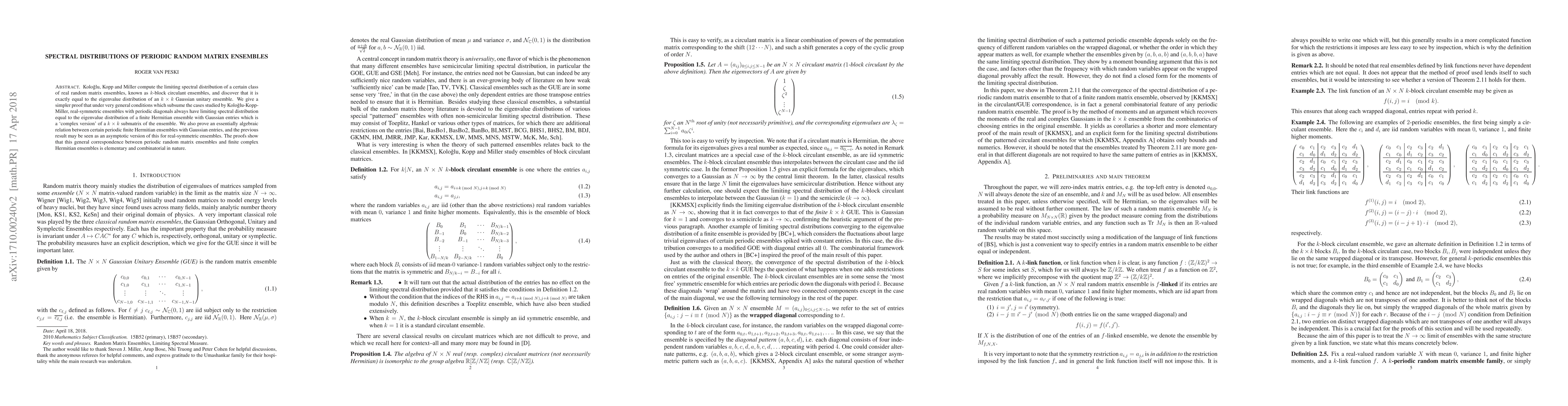 Kolo\u{g}lu, Kopp and Miller compute the limiting spectral distribution of a certain class of real random matrix ensembles, known as $k$-block circulant ensembles, and discover that it is exactly equal to the eigenvalue distribution of an $k \times k$ Gaussian unitary ensemble. We give a simpler proof that under very general conditions which subsume the cases studied by Kolo\u{g}lu-Kopp-Miller, real-symmetric ensembles with periodic diagonals always have limiting spectral distribution equal to the eigenvalue distribution of a finite Hermitian ensemble with Gaussian entries which is a `complex version' of a $k \times k$ submatrix of the ensemble. We also prove an essentially algebraic relation between certain periodic finite Hermitian ensembles with Gaussian entries, and the previous result may be seen as an asymptotic version of this for real-symmetric ensembles. The proofs show that this general correspondence between periodic random matrix ensembles and finite complex Hermitian ensembles is elementary and combinatorial in nature.