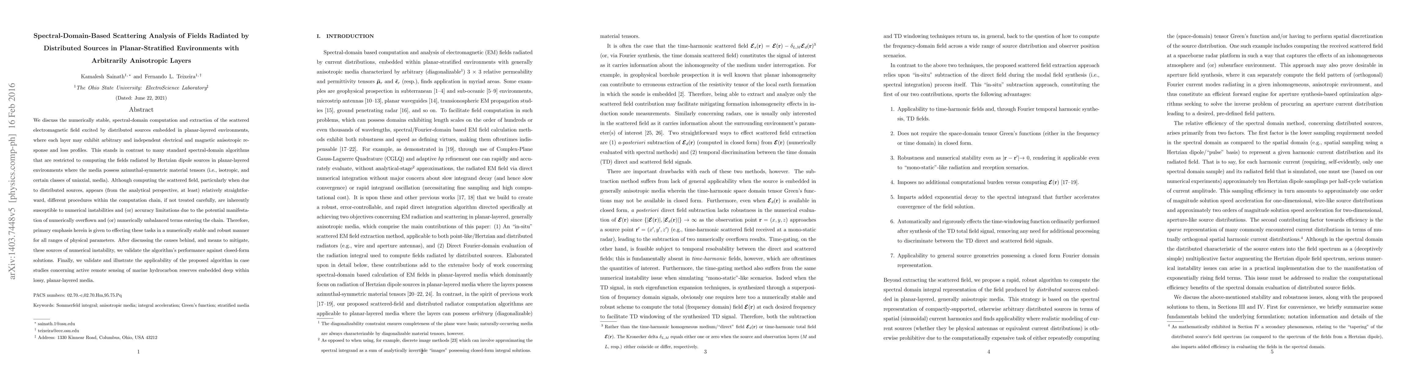 This paper presents a numerically stable spectral-domain method for computing scattered electromagnetic fields from distributed sources in planar-layered environments with anisotropic layers. The method addresses numerical instabilities and accuracy limitations, validated against closed-form solutions and applied to remote sensing of marine hydrocarbons.