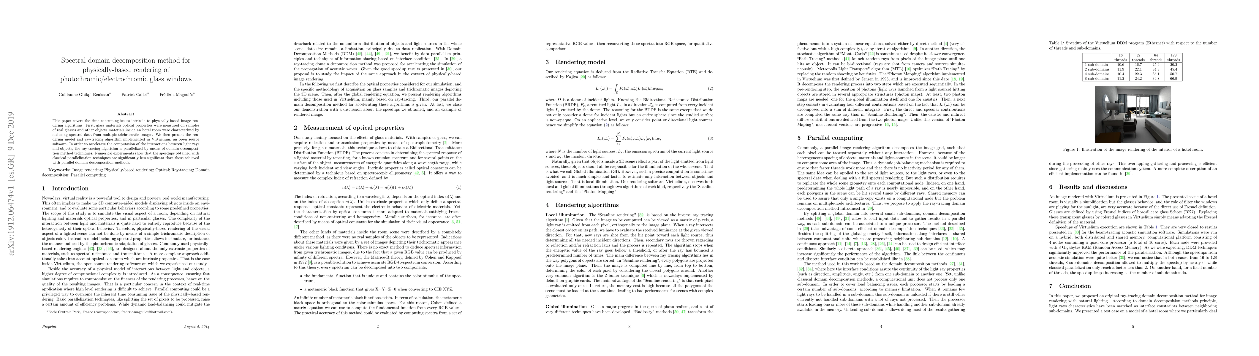 This paper proposes a spectral domain decomposition method for accelerating physically-based rendering of photochromic/electrochromic glass windows, achieving significant speedups over classical parallelization techniques through parallel ray-tracing in Virtuelium software.