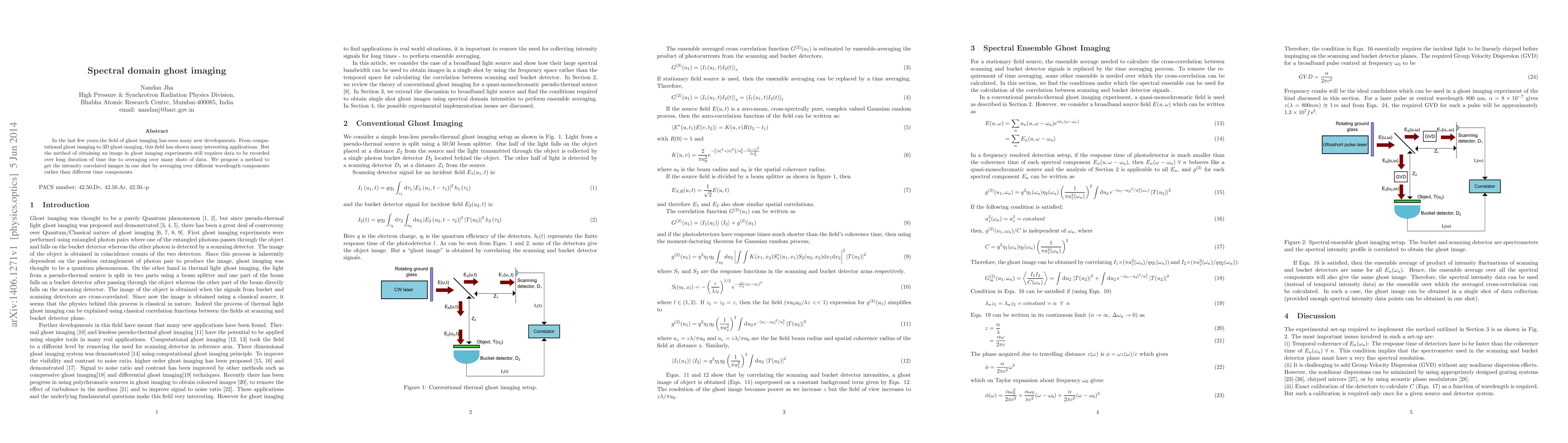 Spectral domain ghost imaging proposes a method to obtain intensity correlated images in a single shot by averaging over different wavelength components instead of time, significantly reducing the data collection duration compared to traditional methods. This advancement enhances the efficiency and potential applications of ghost imaging techniques.