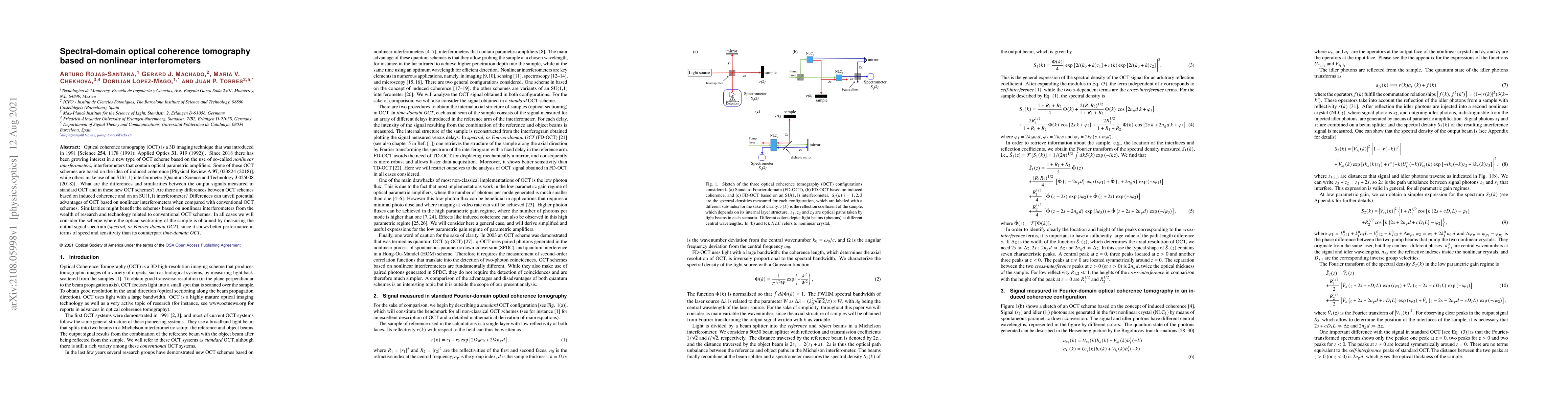Optical coherence tomography (OCT) is a 3D imaging technique that was introduced in 1991 [Science 254, 1178 (1991); Applied Optics 31, 919 (1992)]. Since 2018 there has been growing interest in a new type of OCT scheme based on the use of so-called nonlinear interferometers, interferometers that contain optical parametric amplifiers. Some of these OCT schemes are based on the idea of induced coherence [Physical Review A 97, 023824 (2018)], while others make use of an SU(1,1) interferometer [Quantum Science and Technology 3 025008 (2018)]. What are the differences and similarities between the output signals measured in standard OCT and in these new OCT schemes? Are there any differences between OCT schemes based on induced coherence and on an SU(1,1) interferometer? Differences can unveil potential advantages of OCT based on nonlinear interferometers when compared with conventional OCT schemes. Similarities might benefit the schemes based on nonlinear interferometers from the wealth of research and technology related to conventional OCT schemes. In all cases we will consider the scheme where the optical sectioning of the sample is obtained by measuring the output signal spectrum (spectral, or Fourier-domain OCT), since it shows better performance in terms of speed and sensitivity than its counterpart time-domain OCT.