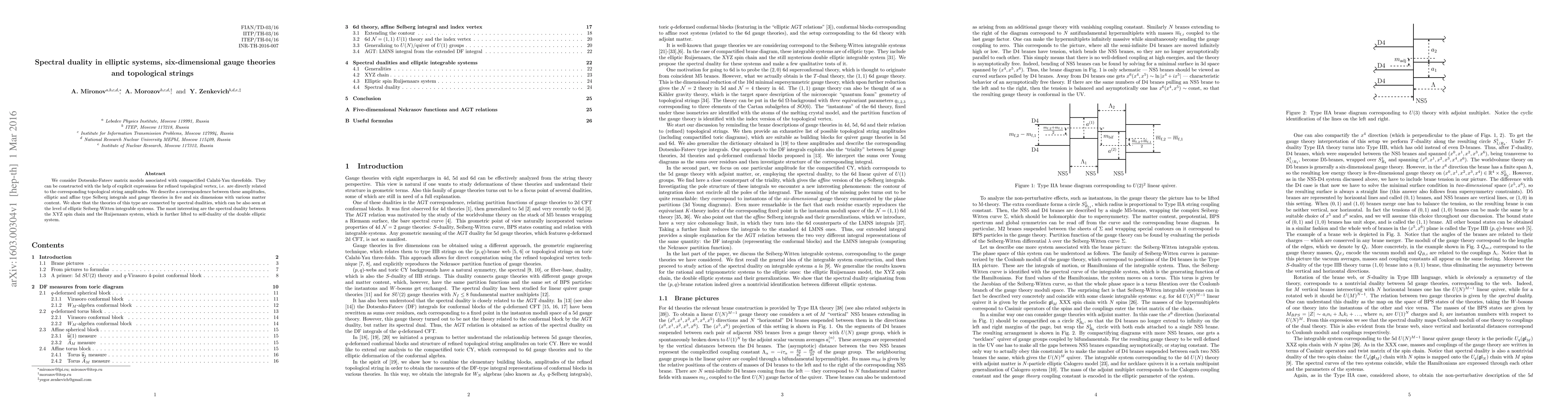 We consider Dotsenko-Fateev matrix models associated with compactified Calabi-Yau threefolds. They can be constructed with the help of explicit expressions for refined topological vertex, i.e. are directly related to the corresponding topological string amplitudes. We describe a correspondence between these amplitudes, elliptic and affine type Selberg integrals and gauge theories in five and six dimensions with various matter content. We show that the theories of this type are connected by spectral dualities, which can be also seen at the level of elliptic Seiberg-Witten integrable systems. The most interesting are the spectral duality between the XYZ spin chain and the Ruijsenaars system, which is further lifted to self-duality of the double elliptic system.