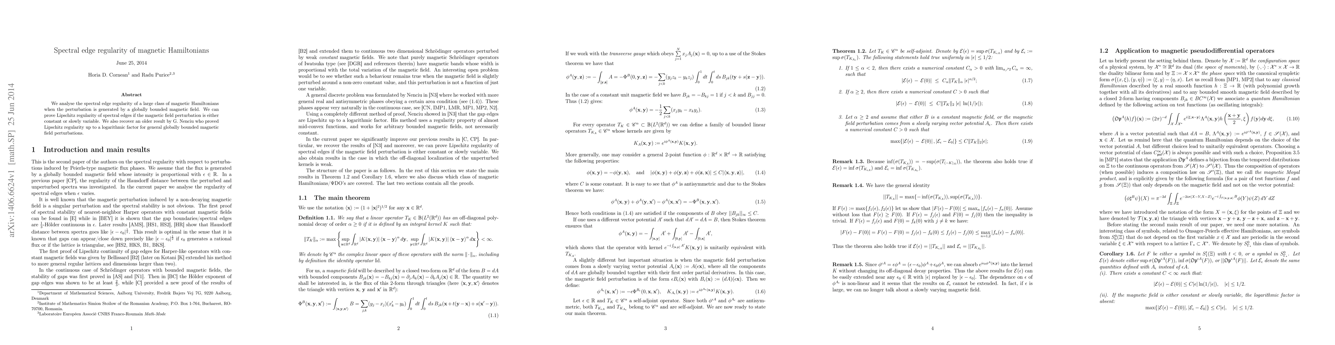 We analyse the spectral edge regularity of a large class of magnetic Hamiltonians when the perturbation is generated by a globally bounded magnetic field. We can prove Lipschitz regularity of spectral edges if the magnetic field perturbation is either constant or slowly variable. We also recover an older result by G. Nenciu who proved Lipschitz regularity up to a logarithmic factor for general globally bounded magnetic field perturbations.