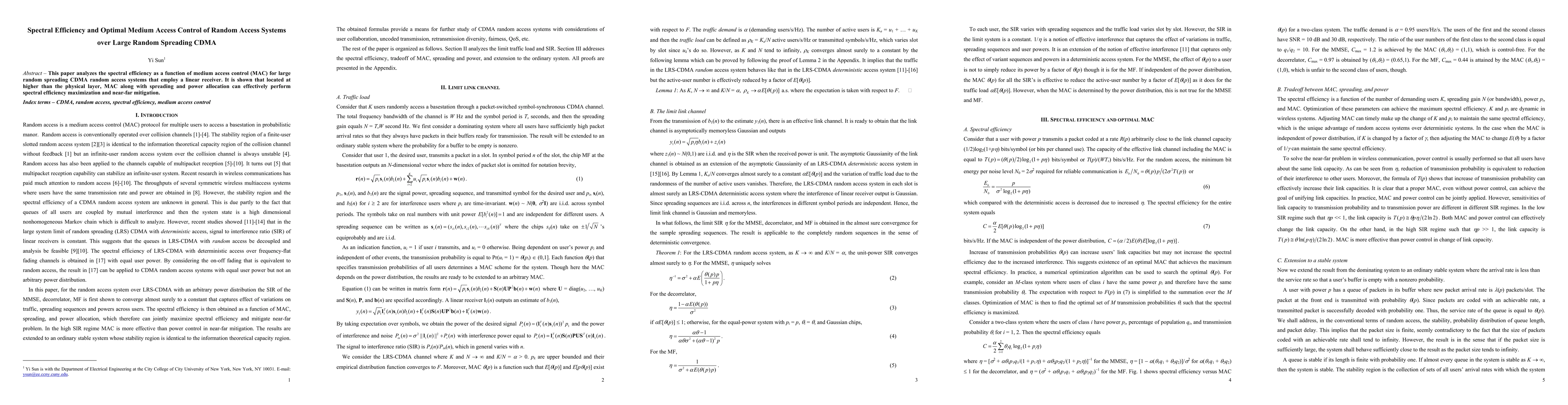 This paper investigates the spectral efficiency of large random spreading CDMA random access systems, demonstrating that optimal medium access control, combined with spreading and power allocation, can maximize spectral efficiency and mitigate near-far effects.