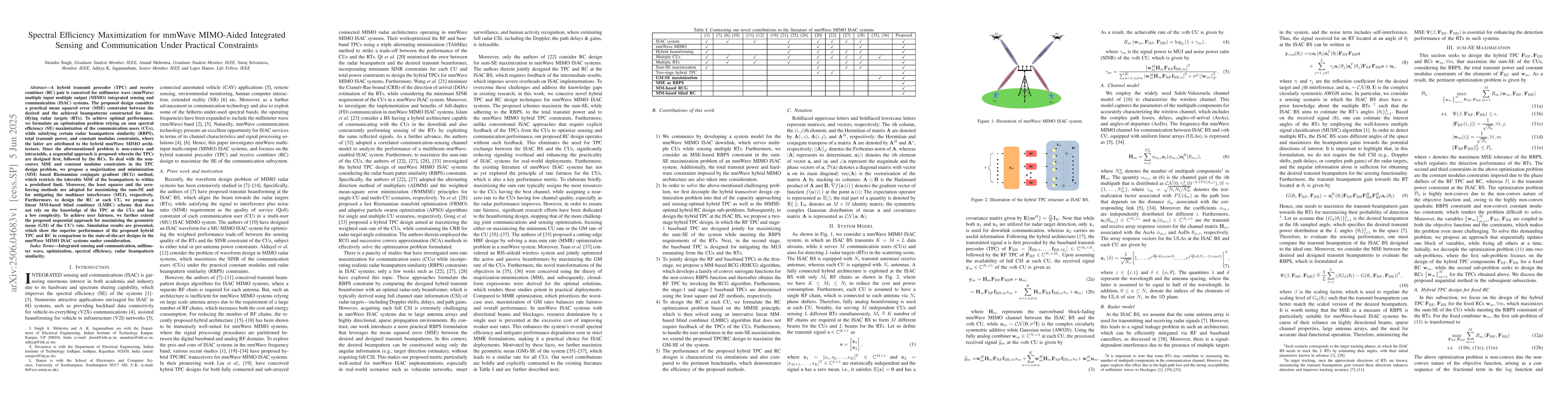 The paper presents a novel sequential hybrid TPC and RC design method for mmWave MIMO ISAC systems, incorporating MM-based RCG for TPC optimization and LMBC for RC optimization, ensuring practical constraints satisfaction and user fairness.
