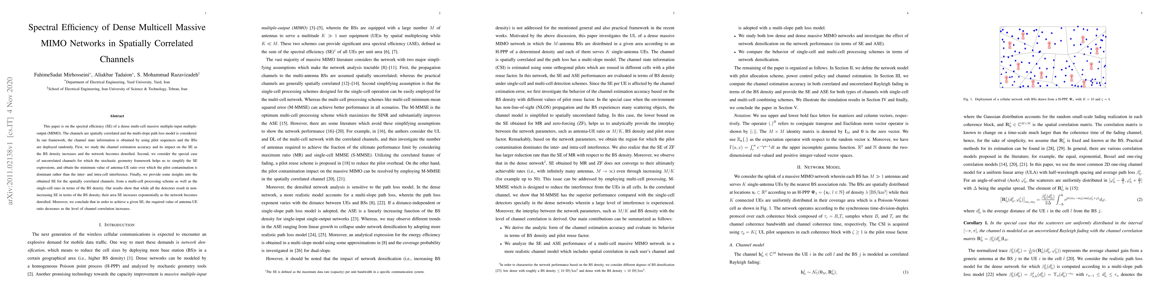 The paper investigates the spectral efficiency of dense multicell massive MIMO networks in spatially correlated channels, finding that increasing BS density increases area SE exponentially but decreases antenna-UE ratio for a given SE as channel correlation level rises.