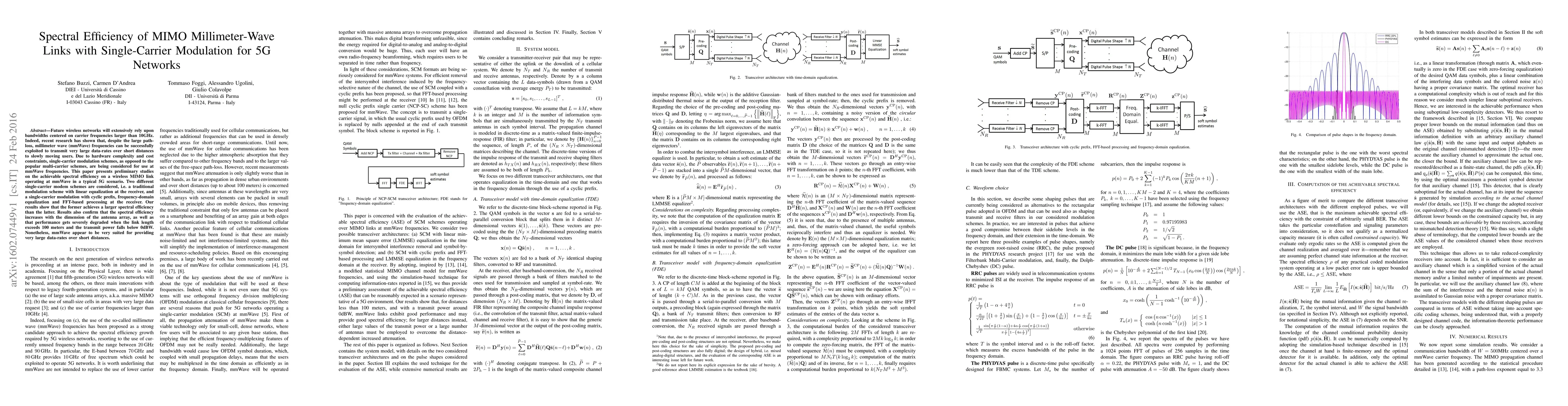 This paper investigates the spectral efficiency of MIMO millimeter-wave (mmWave) links using single-carrier modulation for 5G networks. It compares two single-carrier schemes and concludes that traditional linear equalization achieves higher spectral efficiency, while performance degrades beyond 100 meters and low transmit power.