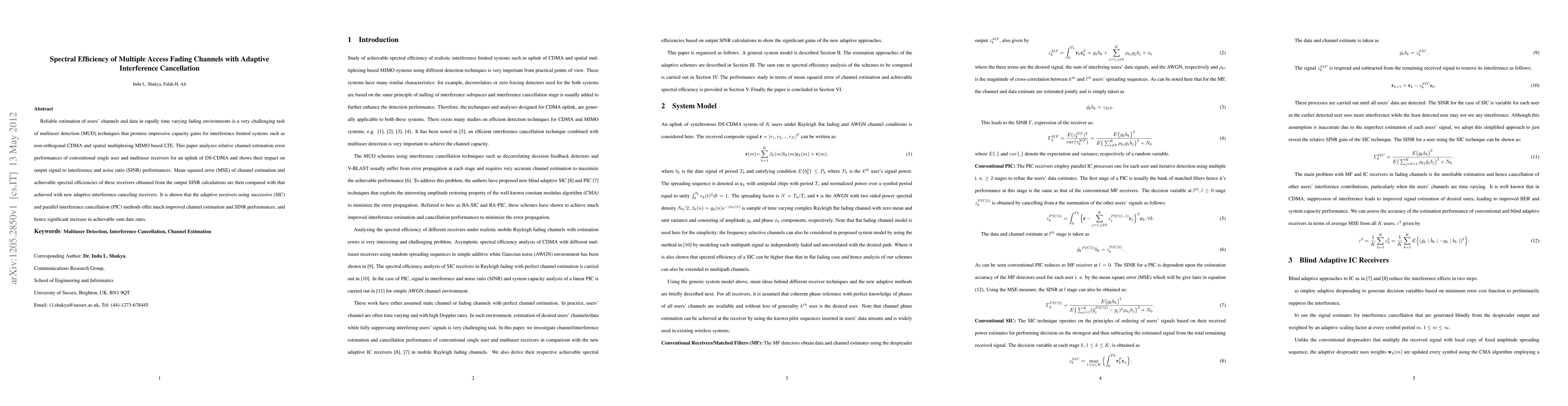 This paper evaluates the spectral efficiency of multiple access channels in fading environments using adaptive interference cancellation techniques. It demonstrates that adaptive receivers with successive and parallel interference cancellation significantly improve channel estimation and SINR performance, leading to higher achievable sum data rates compared to conventional single and multiuser receivers.