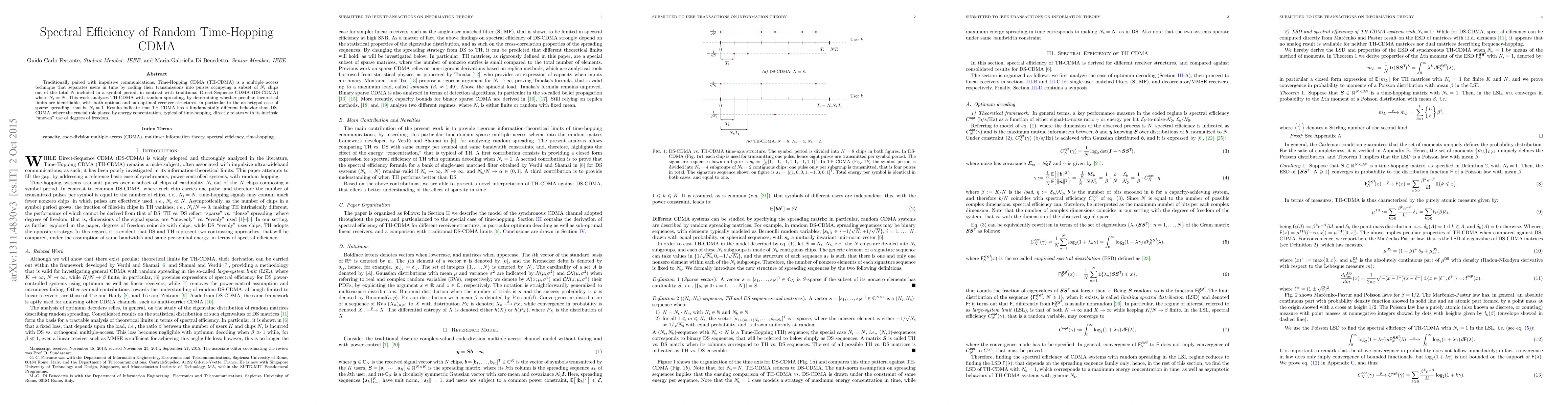 This paper investigates the spectral efficiency of Random Time-Hopping CDMA (TH-CDMA) with random spreading, contrasting it with Direct-Sequence CDMA. It finds that TH-CDMA, especially in sparse spreading scenarios, exhibits unique behavior due to its energy concentration and uneven use of time-spreading degrees of freedom.