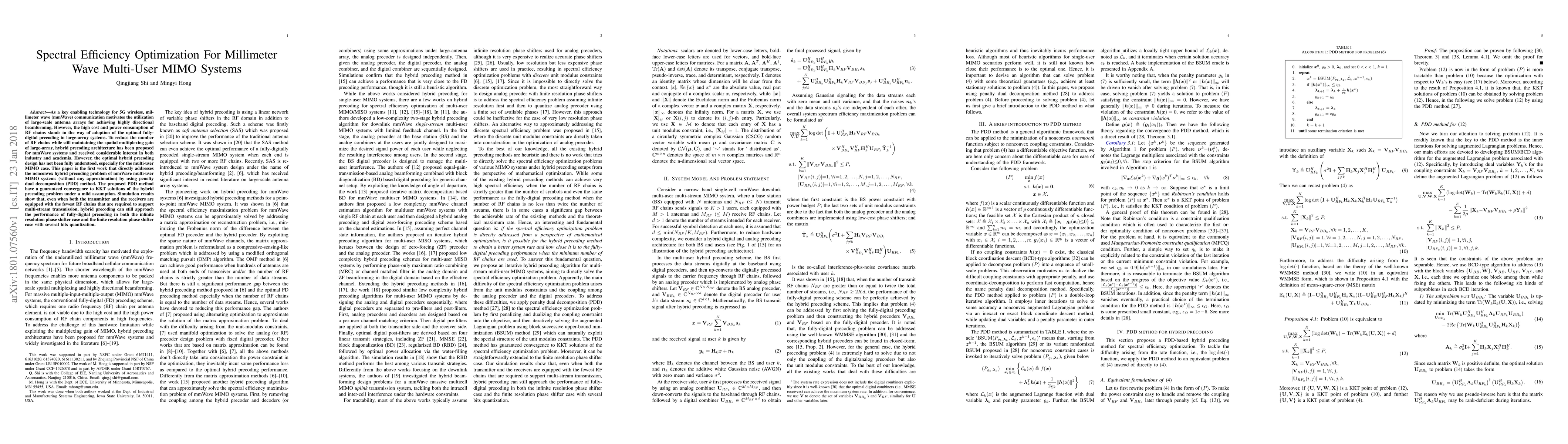 As a key enabling technology for 5G wireless, millimeter wave (mmWave) communication motivates the utilization of large-scale antenna arrays for achieving highly directional beamforming. However, the high cost and power consumption of RF chains stands in the way of adoption of the optimal fullydigital precoding in large-array systems. To reduce the number of RF chains while still maintaining the spatial multiplexing gain of large-array, hybrid precoding architecture has been proposed for mmWave systems and received considerable interest in both industry and academia. However, the optimal hybrid precoding design has not been fully understood, especially for the multi-user MIMO case. This paper is the first work that directly addresses the nonconvex hybrid precoding problem of mmWave multi-user MIMO systems (without any approximation) by using penalty dual decomposition (PDD) method. The proposed PDD method have a guaranteed convergence to KKT solutions of the hybrid precoding problem under a mild assumption. Simulation results show that, even when both the transmitter and the receivers are equipped with the fewest RF chains that are required to support multi-stream transmission, hybrid precoding can still approach the performance of fully-digital precoding in both the infinite resolution phase shifter case and the finite resolution phase shifter case with several bits quantization.