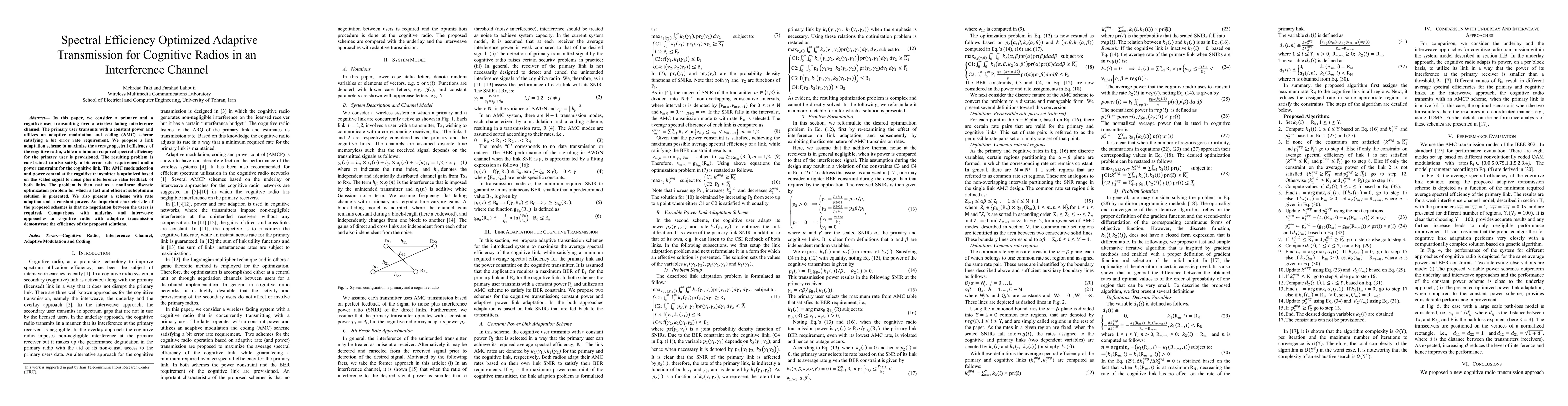 This paper proposes an adaptive transmission scheme for cognitive radios in an interference channel to maximize spectral efficiency while ensuring a minimum efficiency for the primary user, employing AMC and power control without requiring user negotiation. Comparative analysis shows the proposed method's efficiency over underlay and interweave approaches.