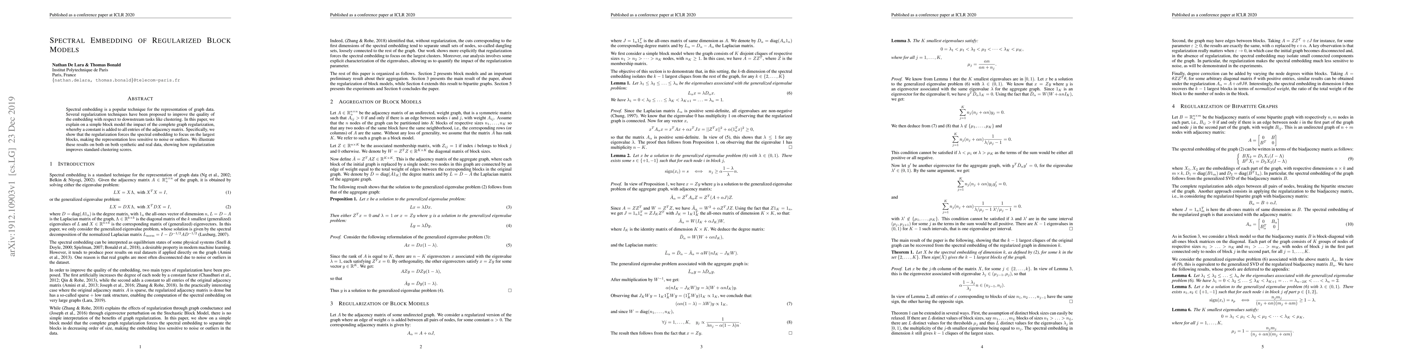 This paper explores the effect of complete graph regularization on spectral embedding for block models, demonstrating that it enhances the focus on the largest blocks and reduces sensitivity to noise, thereby improving clustering performance on both synthetic and real datasets.