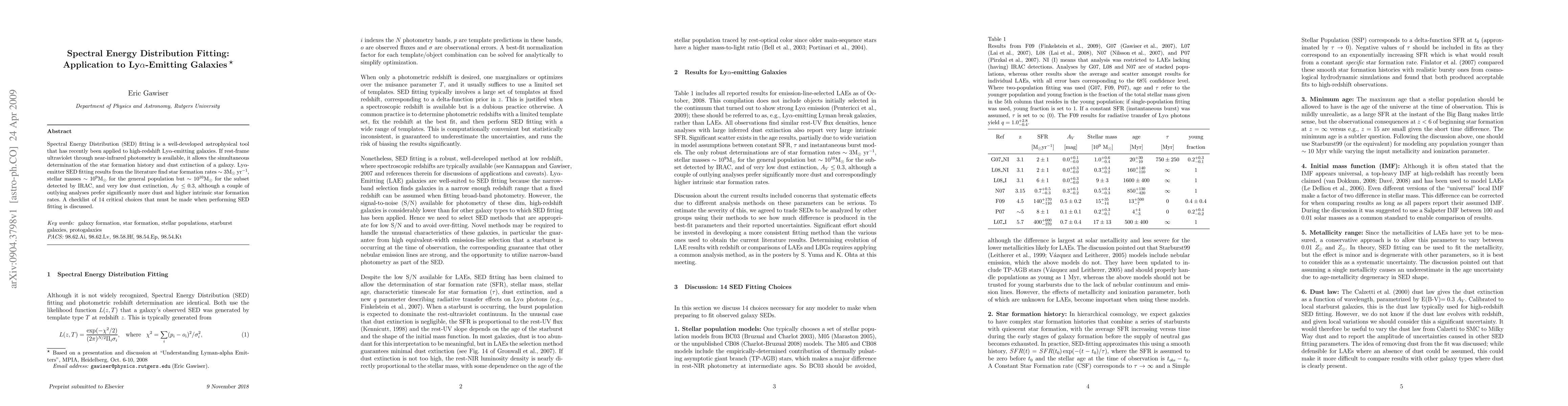 This paper discusses the application of Spectral Energy Distribution (SED) fitting to high-redshift Lyman Alpha-emitting galaxies, revealing star formation rates of ~3 M_sun/yr and low dust extinction, A_V < 0.3. It also outlines 14 critical choices in SED fitting methodology.