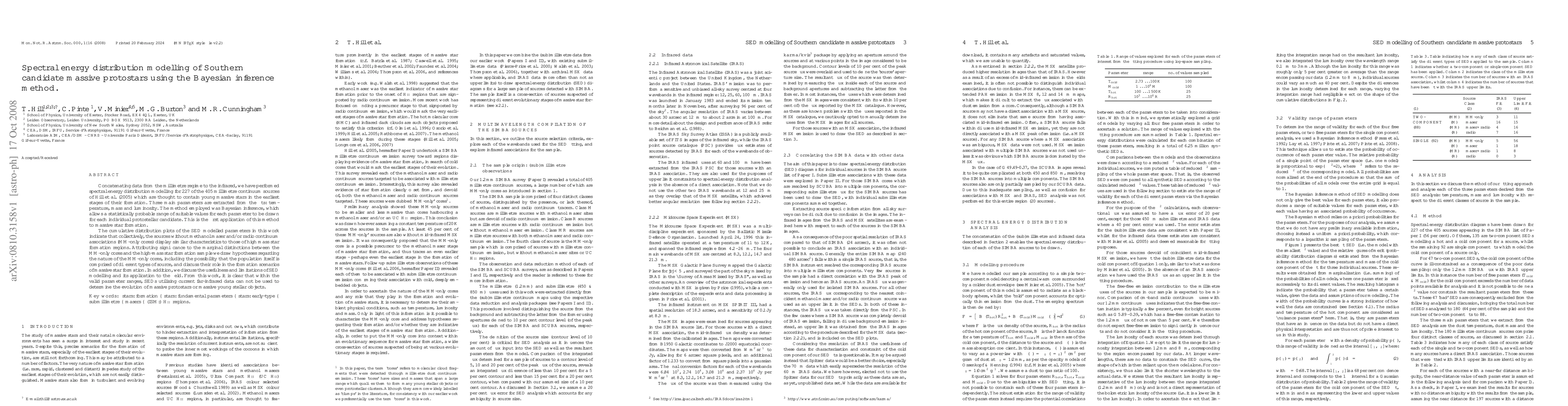 Concatenating data from the millimetre regime to the infrared, we have performed spectral energy distribution modelling for 227 of the 405 millimetre continuum sources of Hill et al. (2005) which are thought to contain young massive stars in the earliest stages of their formation. Three main parameters are extracted from the fits: temperature, mass and luminosity. The method employed was Bayesian inference, which allows a statistically probable range of suitable values for each parameter to be drawn for each individual protostellar candidate. This is the first application of this method to massive star formation. The cumulative distribution plots of the SED modelled parameters in this work indicate that collectively, the sources without methanol maser and/or radio continuum associations (MM-only cores) display similar characteristics to those of high mass star formation regions. Attributing significance to the marginal distinctions between the MM-only cores and the high-mass star formation sample we draw hypotheses regarding the nature of the MM-only cores, including the possibility that the population itself is comprised of different types of source, and discuss their role in the formation scenarios of massive star formation. In addition, we discuss the usefulness and limitations of SED modelling and its application to the field. From this work, it is clear that within the valid parameter ranges, SEDs utilising current far-infrared data can not be used to determine the evolution of massive protostars or massive young stellar objects.
