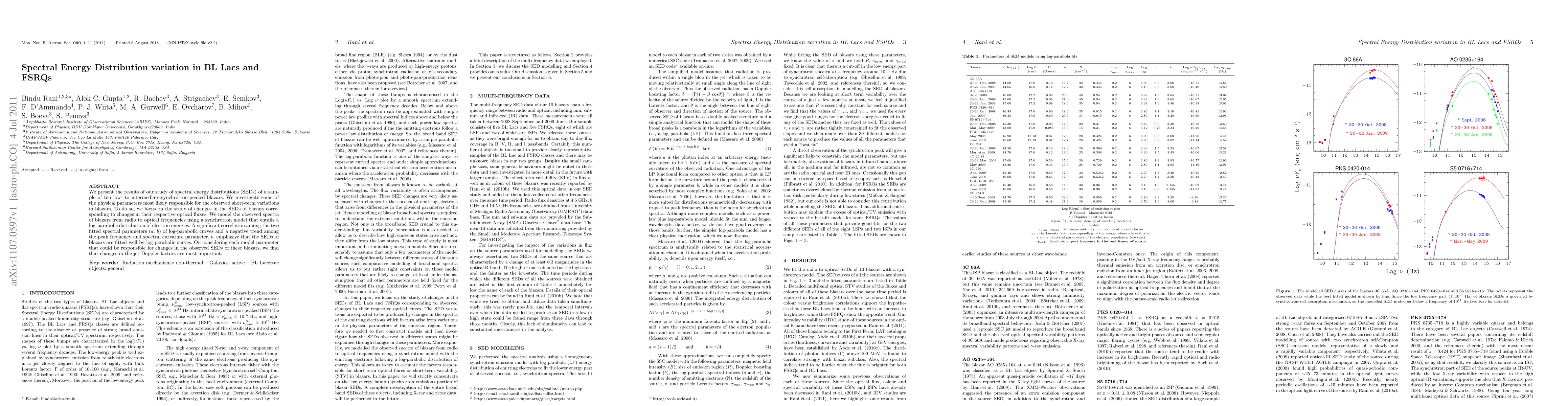We present the results of our study of spectral energy distributions (SEDs) of a sample of ten low- to intermediate-synchrotron-peaked blazars. We investigate some of the physical parameters most likely responsible for the observed short-term variations in blazars. To do so, we focus on the study of changes in the SEDs of blazars corresponding to changes in their respective optical fluxes. We model the observed spectra of blazars from radio to optical frequencies using a synchrotron model that entails a log-parabolic distribution of electron energies. A significant correlation among the two fitted spectral parameters ($a$, $b$) of log-parabolic curves and a negative trend among the peak frequency and spectral curvature parameter, $b$, emphasize that the SEDs of blazars are fitted well by log-parabolic curves. On considering each model parameter that could be responsible for changes in the observed SEDs of these blazars, we find that changes in the jet Doppler factors are most important.