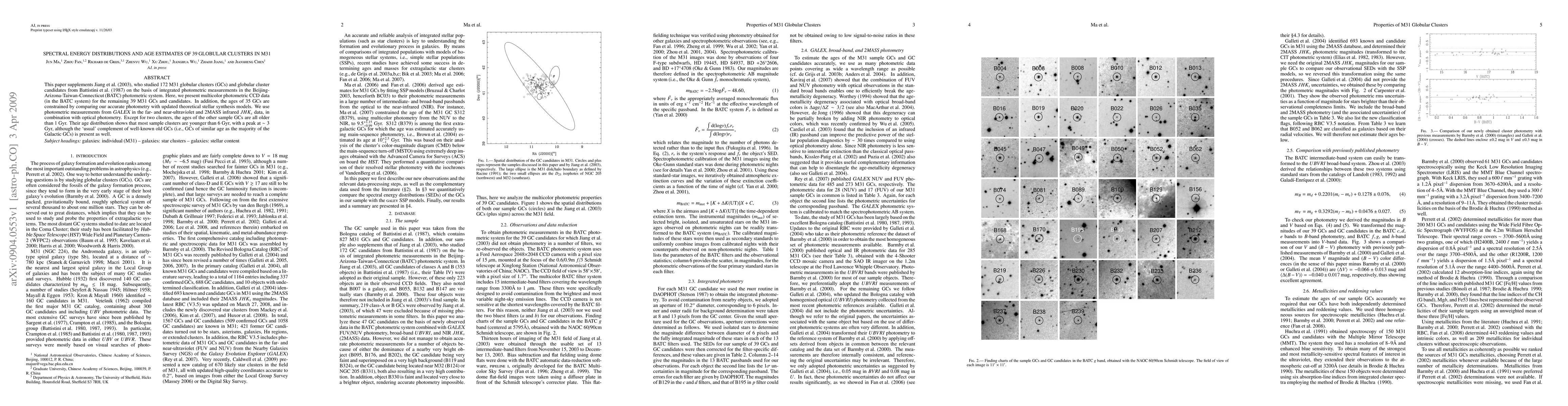 This paper supplements Jiang et al. (2003), who studied 172 M31 globular clusters (GCs) and globular cluster candidates from Battistini et al. (1987) on the basis of integrated photometric measurements in the Beijing-Arizona-Taiwan-Connecticut (BATC) photometric system. Here, we present multicolor photometric CCD data (in the BATC system) for the remaining 39 M31 GCs and candidates. In addition, the ages of 35 GCs are constrained by comparing our accurate photometry with updated theoretical stellar synthesis models. We use photometric measurements from GALEX in the far- and near-ultraviolet and 2MASS infrared $JHK_s$ data, in combination with optical photometry. Except for two clusters, the ages of the other sample GCs are all older than 1 Gyr. Their age distribution shows that most sample clusters are younger than 6 Gyr, with a peak at ~3 Gyr, although the `usual' complement of well-known old GCs (i.e., GCs of similar age as the majority of the Galactic GCs) is present as well.